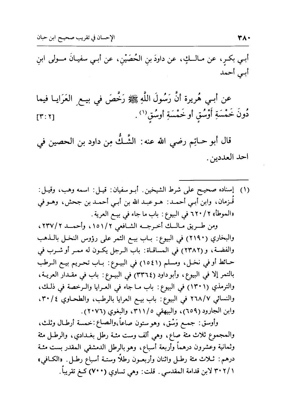5006 - أخبرنا الحسين بن إدريس الأنصاريقال: أَخْبَرَنَا أَحْمَدُ بْنُ أَبِي بَكْرٍ، عَنْ مَالِكٍ، عَنْ دَاوُدَ بْنِ الْحُصَيْنِ، عَنْ أَبِي سُفْيَانَ مَوْلَى ابْنِ أَبِي أَحْمَدَ عَنْ أَبِي هُرَيْرَةَ: "أَنَّ رَسُولَ اللَّهِ صَلَّى اللَّهُ عَلَيْهِ وَسَلَّمَ رَخَّصَ فِي بَيْعِ الْعَرَايَا فِيمَا دُونَ خَمْسَةِ أَوْسُقٍ أَوْ خَمْسَةِ أَوْسُقٍ" 1. [2: 7]