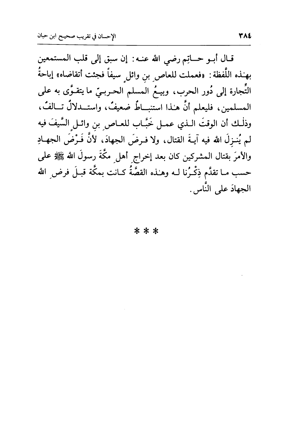 قال أبو حاتم رضى الله تعالى عَنْهُ: إِنْ سَبَقَ إِلَى قَلْبِ الْمُسْتَمِعِينَ بِهَذِهِ اللَّفْظَةِ: "فَعَمِلْتُ لِلْعَاصِ بْنِ وَائِلٍ سَيْفًا فَجِئْتُ أَتَقَاضَاهُ" إِبَاحَةُ التِّجَارَةِ إِلَى دُورِ الْحَرْبِ، وَبَيْعُ الْمُسْلِمِ الْحَرْبِيَّ مَا يَتَقَوَّى بِهِ عَلَى الْمُسْلِمِينَ، فَلْيَعْلَمْ أَنَّ هَذَا اسْتِنْبَاطٌ ضَعِيفٌ، وَاسْتِدْلَالٌ تَالِفٌ، وَذَلِكَ أَنَّ الْوَقْتَ الَّذِي عَمِلَ خَبَّابٌ لِلْعَاصِ بْنِ وَائِلٍ السَّيْفَ فِيهِ لَمْ يُنْزِلِ اللَّهُ فِيهِ آيَةَ الْقِتَالِ، وَلَا فَرَضَ الْجِهَادَ، لِأَنَّ فَرْضَ الْجِهَادِ وَالْأَمْرَ بِقِتَالِ الْمُشْرِكِينَ كَانَ بَعْدَ إِخْرَاجِ أَهْلِ مَكَّةَ رَسُولُ اللَّهِ صَلَّى اللَّهُ عَلَيْهِ وَسَلَّمَ عَلَى حَسَبِ مَا تَقَدَّمَ ذِكْرُنَا لَهُ وَهَذِهِ الْقِصَّةُ كَانَتْ بِمَكَّةَ قَبْلَ فَرْضِ الله الجهاد على الناس.