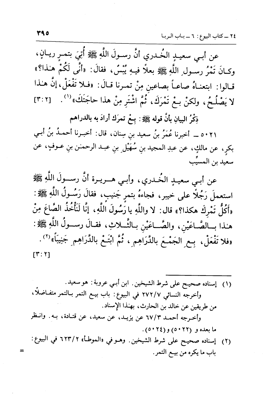5021 - أَخْبَرَنَا عُمَرُ بْنُ سَعِيدِ بْنِ سِنَانٍ، قَالَ: أَخْبَرَنَا أَحْمَدُ بْنُ أَبِي بَكْرٍ، عَنْ مَالِكٍ، عن عَبْدِ الْمَجِيدِ بْنِ سُهَيْلِ بْنِ عَبْدِ الرَّحْمَنِ بْنِ عَوْفٍ، عَنْ سَعِيدِ بْنِ الْمُسَيِّبِ عَنْ أَبِي سَعِيدٍ الْخُدْرِيِّ، وَأَبِي هُرَيْرَةَ أَنَّ رَسُولَ اللَّهِ صَلَّى اللَّهُ عَلَيْهِ وَسَلَّمَ اسْتَعْمَلَ رَجُلًا عَلَى خَيْبَرَ، فَجَاءَهُ بِتَمْرٍ جَنِيبٍ، فَقَالَ رَسُولُ اللَّهِ صَلَّى اللَّهُ عَلَيْهِ وَسَلَّمَ: "أَكَلَ تَمْرَكَ هَكَذَا؟ " قَالَ: لَا وَاللَّهِ يَا رَسُولَ اللَّهِ، إِنَّا لَنَأْخُذُ الصَّاعَ مِنْ هَذَا بِالصَّاعَيْنِ، وَالصَّاعَيْنِ، بِالثَّلَاثِ، فَقَالَ رَسُولُ اللَّهِ صَلَّى اللَّهُ عَلَيْهِ وَسَلَّمَ: "فَلَا تَفْعَلْ، بِعِ الْجَمْعَ بِالدَّرَاهِمِ، ثُمَّ ابتع بالدراهم جنيبا"1. [2: 3]