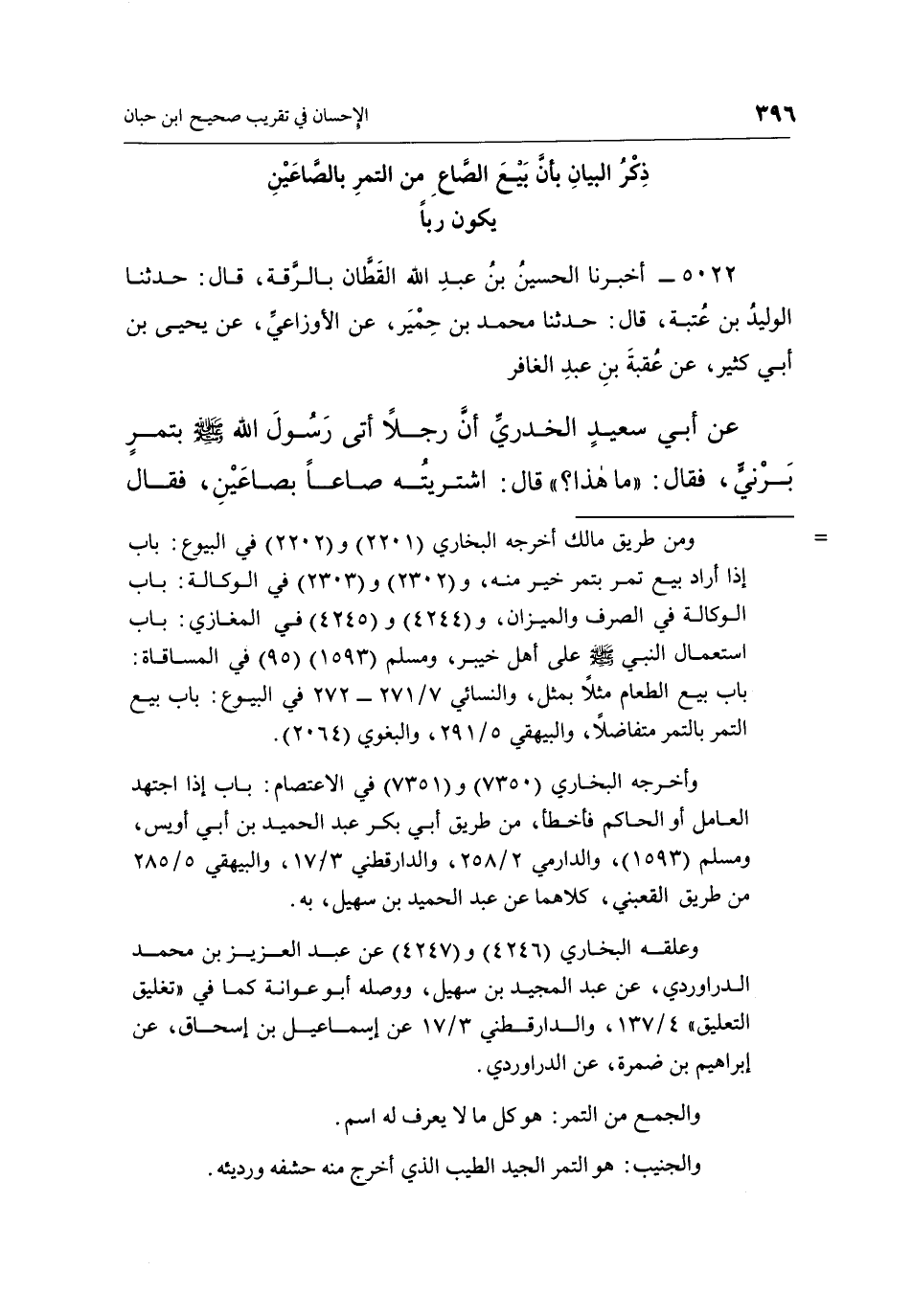 5022 - أَخْبَرَنَا الْحُسَيْنُ بْنُ عَبْدِ اللَّهِ الْقَطَّانُ بِالرَّقَّةِ، قَالَ: حَدَّثَنَا الْوَلِيدُ بْنُ عُتْبَةَ، قَالَ: حَدَّثَنَا مُحَمَّدُ بْنُ حِمْيَرٍ، عَنِ الْأَوْزَاعِيُّ، عَنْ يَحْيَى بْنِ أَبِي كَثِيرٍ، عَنْ عُقْبَةَ بْنِ عَبْدِ الْغَافِرِ عَنْ أَبِي سَعِيدٍ الْخُدْرِيِّ أَنَّ رَجُلًا أَتَى رَسُولَ اللَّهِ صَلَّى اللَّهُ عَلَيْهِ وَسَلَّمَ بِتَمْرٍ بَرْنِيٍّ، فَقَالَ: "مَا هَذَا؟ " قَالَ: اشْتَرَيْتُهُ صَاعًا بِصَاعَيْنِ، فَقَالَ