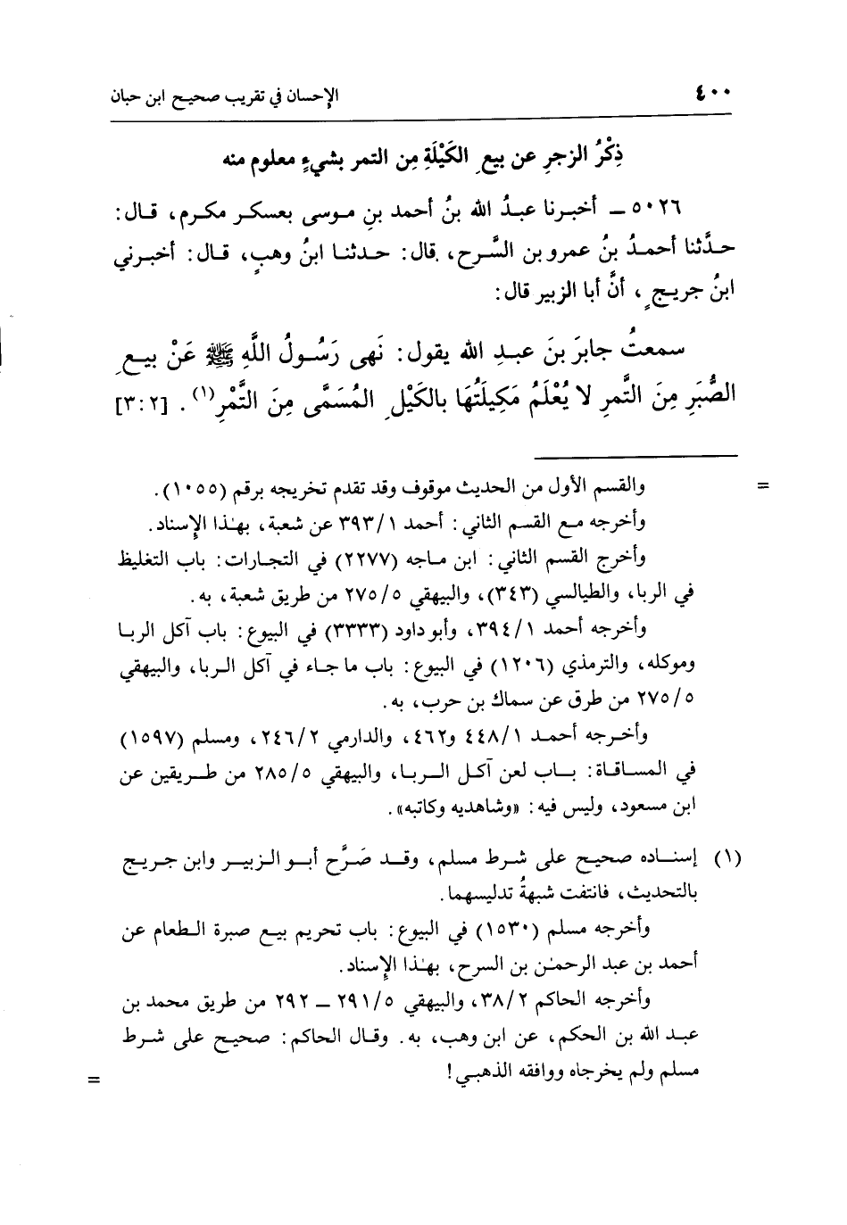 5026 - أَخْبَرَنَا عَبْدُ اللَّهِ بْنُ أَحْمَدَ بْنِ مُوسَى بِعَسْكَرِ مُكْرَمٍ، قَالَ: حَدَّثَنَا أَحْمَدُ بْنُ عَمْرِو بْنُ السَّرْحِ، قَالَ: حَدَّثَنَا ابْنُ وَهْبٍ، قَالَ: أَخْبَرَنِي ابْنُ جُرَيْجٍ، أَنَّ أَبَا الزُّبَيْرِ قَالَ: سَمِعْتُ جَابِرَ بْنَ عَبْدِ اللَّهِ يَقُولُ: "نَهَى رَسُولُ اللَّهِ صَلَّى اللَّهُ عَلَيْهِ وَسَلَّمَ عَنْ بَيْعِ الصَّبْرِ مِنَ التَّمْرِ لَا يُعْلَمُ مَكِيلَتُهَا بِالْكَيْلِ الْمُسَمَّى مِنَ التَّمْرِ"1. [2: 3]