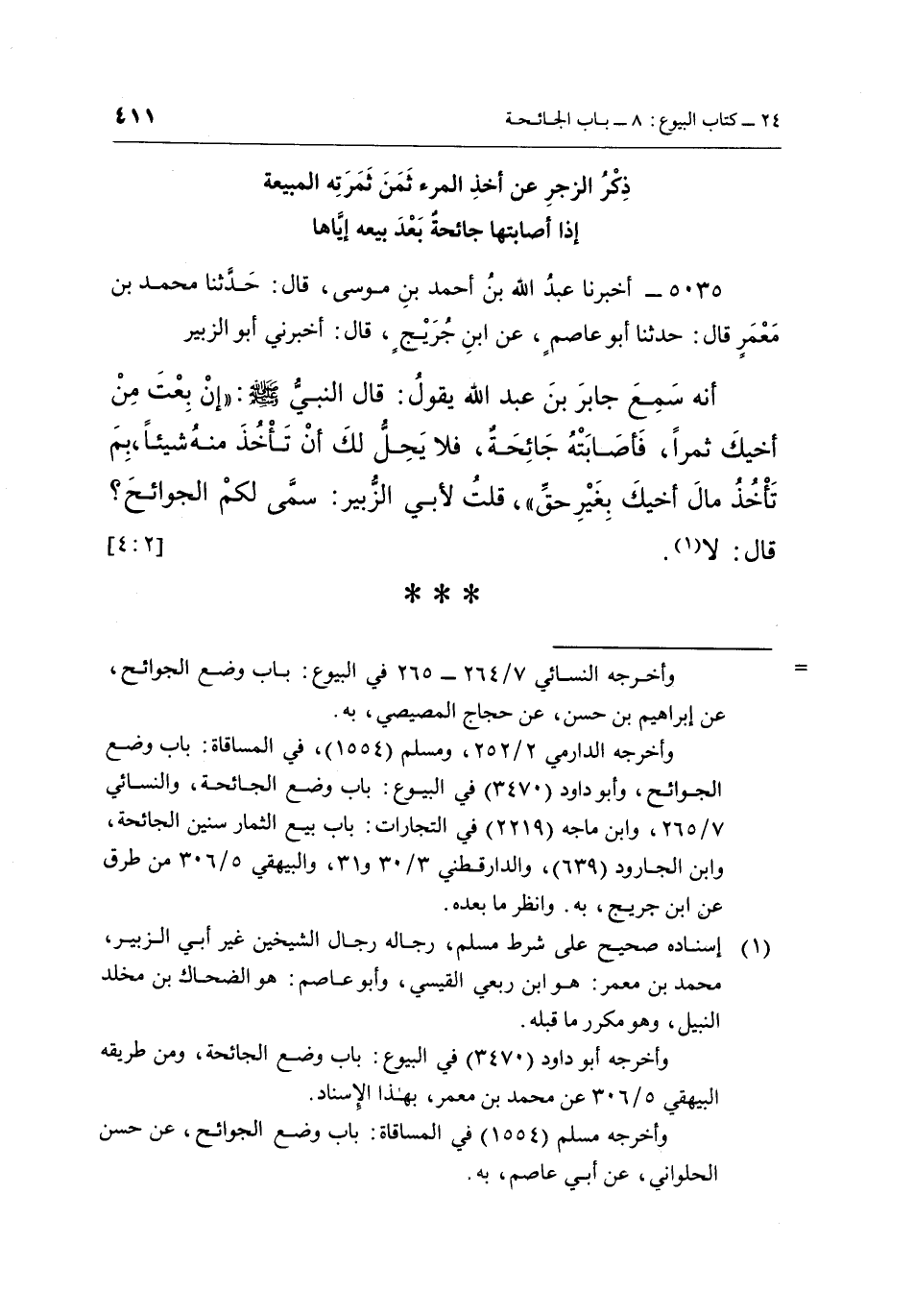 5035 - أَخْبَرَنَا عَبْدُ اللَّهِ بْنُ أَحْمَدَ بْنِ مُوسَى، قَالَ: حَدَّثَنَا مُحَمَّدُ بْنُ مَعْمَرٍ قَالَ: حَدَّثَنَا أبو عاصم، عن بن جُرَيْجٍ، قَالَ: أَخْبَرَنِي أَبُو الزُّبَيْرِ أَنَّهُ سَمِعَ جَابِرَ بْنَ عَبْدِ اللَّهِ يَقُولُ: قَالَ النَّبِيُّ صَلَّى اللَّهُ عَلَيْهِ وَسَلَّمَ: "إِنَّ بِعْتَ مِنْ أَخِيكَ ثَمَرًا، فَأَصَابَتْهُ جَائِحَةٌ، فَلَا يَحِلُّ لَكَ أَنْ تَأْخُذَ مِنْهُ شَيْئًا، بِمَ تَأْخُذُ مَالَ أَخِيكَ بِغَيْرِ حَقٍّ"، قُلْتُ لِأَبِي الزُّبَيْرِ: سَمَّى لكم الجوائح؟ قال: لا1. [1: 78]