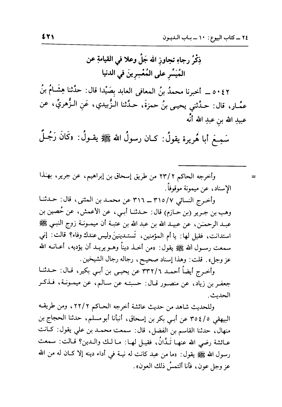 5042 - أَخْبَرَنَا مُحَمَّدُ بْنُ الْمُعَافَى الْعَابِدُ بِصَيْدَا قَالَ: حَدَّثَنَا هِشَامُ بْنُ عَمَّارٍ، قَالَ: حَدَّثَنِي يَحْيَى بْنُ حَمْزَةَ، حَدَّثَنَا الزُّبَيْدِيِّ، عَنِ الزُّهْرِيِّ، عَنْ عُبَيْدِ اللَّهِ بْنِ عَبْدِ اللَّهِ أَنَّهُ سَمِعَ أَبَا هُرَيْرَةَ يَقُولُ: كَانَ رَسُولُ اللَّهِ صَلَّى اللَّهُ عَلَيْهِ وَسَلَّمَ يَقُولُ: "كَانَ رَجُلٌ تَاجِرٌ يُدَايِنُ النَّاسَ، فَإِذَا رَأَى إِعْسَارَ الْمُعْسِرِ قَالَ لِفَتَاهُ: تَجَاوَزْ لَعَلَّ اللَّهَ يَتَجَاوَزُ عَنَّا" قَالَ رَسُولُ اللَّهِ صَلَّى اللَّهُ عَلَيْهِ وَسَلَّمَ: "فَلَقِيَ الله فتجاوز عنه"1. [1: 2]