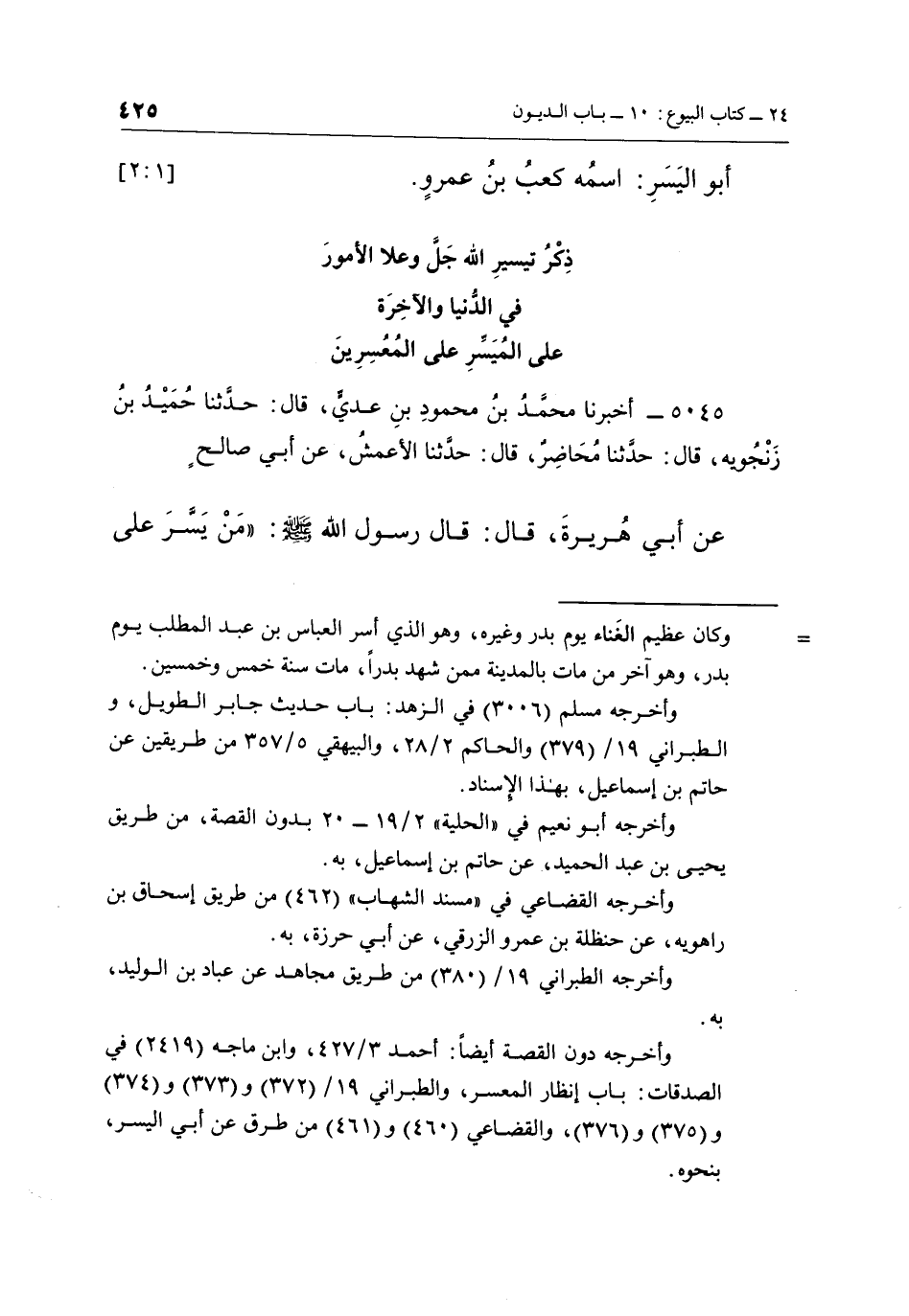 5045 - أَخْبَرَنَا مُحَمَّدُ بْنُ مَحْمُودِ بْنِ عَدِيٍّ، قَالَ: حَدَّثَنَا حُمَيْدُ بْنُ زَنْجُوَيْهِ قَالَ: حَدَّثَنَا مُحَاضِرٌ، قَالَ: حَدَّثَنَا الْأَعْمَشُ، عَنْ أَبِي صَالِحٍ عَنْ أَبِي هُرَيْرَةَ قَالَ: قَالَ رَسُولُ اللَّهِ صَلَّى اللَّهُ عَلَيْهِ وَسَلَّمَ: "مَنْ يَسَّرَ عَلَى مُعْسِرٍ، يَسَّرَ الله عليه في الدنيا والآخرة"1. [1: 2]