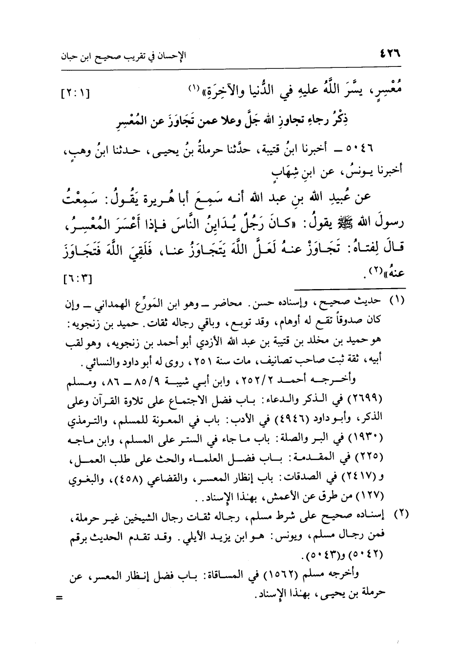 5046 - أخبرنا بْنِ قُتَيْبَةَ حَدَّثَنَا حَرْمَلَةُ بْنُ يَحْيَى، حَدَّثَنَا بن وهب، أخبرنا يونس، عن بن شِهَابٍ عَنْ عُبَيْدِ اللَّهِ بْنِ عَبْدِ اللَّهِ أَنَّهُ سَمِعَ أَبَا هُرَيْرَةَ يَقُولُ: سَمِعْتُ رَسُولَ اللَّهِ صَلَّى اللَّهُ عَلَيْهِ وَسَلَّمَ يَقُولُ: "كَانَ رَجُلٌ يُدَايِنُ النَّاسَ فَإِذَا أَعْسَرَ الْمُعْسِرُ، قَالَ لِفَتَاهُ: تَجَاوَزْ عَنْهُ لَعَلَّ اللَّهَ يَتَجَاوَزُ عَنَّا، فلقي الله فتجاوز عنه"1. [3: 6]