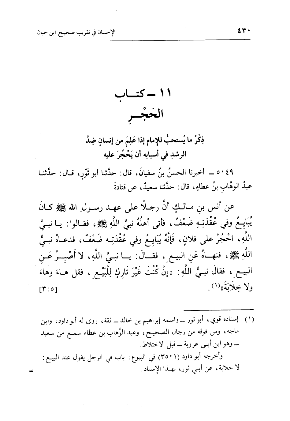 5049 - أَخْبَرَنَا الْحَسَنُ بْنُ سُفْيَانَ، قَالَ: حَدَّثَنَا أَبُو ثَوْرٍ، قَالَ: حَدَّثَنَا عَبْدُ الْوَهَّابِ بْنُ عَطَاءٍ، قَالَ: حَدَّثَنَا سَعِيدٌ، عَنْ قَتَادَةَ عَنْ أَنَسِ بْنِ مَالِكٍ أَنَّ رَجُلًا عَلَى عَهْدِ رَسُولِ اللَّهِ صَلَّى اللَّهُ عَلَيْهِ وَسَلَّمَ كَانَ يُبَايعُ وَفِي عُقْدَتِهِ ضَعْفٌ، فَأَتَى أَهْلُهُ نَبِيَّ اللَّهِ صَلَّى اللَّهُ عَلَيْهِ وَسَلَّمَ فَقَالُوا: يَا نَبِيَّ اللَّهِ، احْجُرْ عَلَى فُلَانٍ، فَإِنَّهُ يُبَايعُ وَفِي عُقْدَتِهِ ضَعْفٌ، فَدَعَاهُ نَبِيُّ اللَّهِ صَلَّى اللَّهُ عَلَيْهِ وَسَلَّمَ، فَنَهَاهُ عَنِ الْبَيْعِ، فَقَالَ: يَا نَبِيَّ اللَّهِ، لَا أَصْبِرْ عَنِ الْبَيْعِ، فَقَالَ نَبِيُّ اللَّهِ: "إِنْ كُنْتَ غَيْرَ تَارِكٍ لِلْبَيْعِ، فَقُلْ هَاءً وَهَاءً وَلَا خلابة"1. [5: 36]