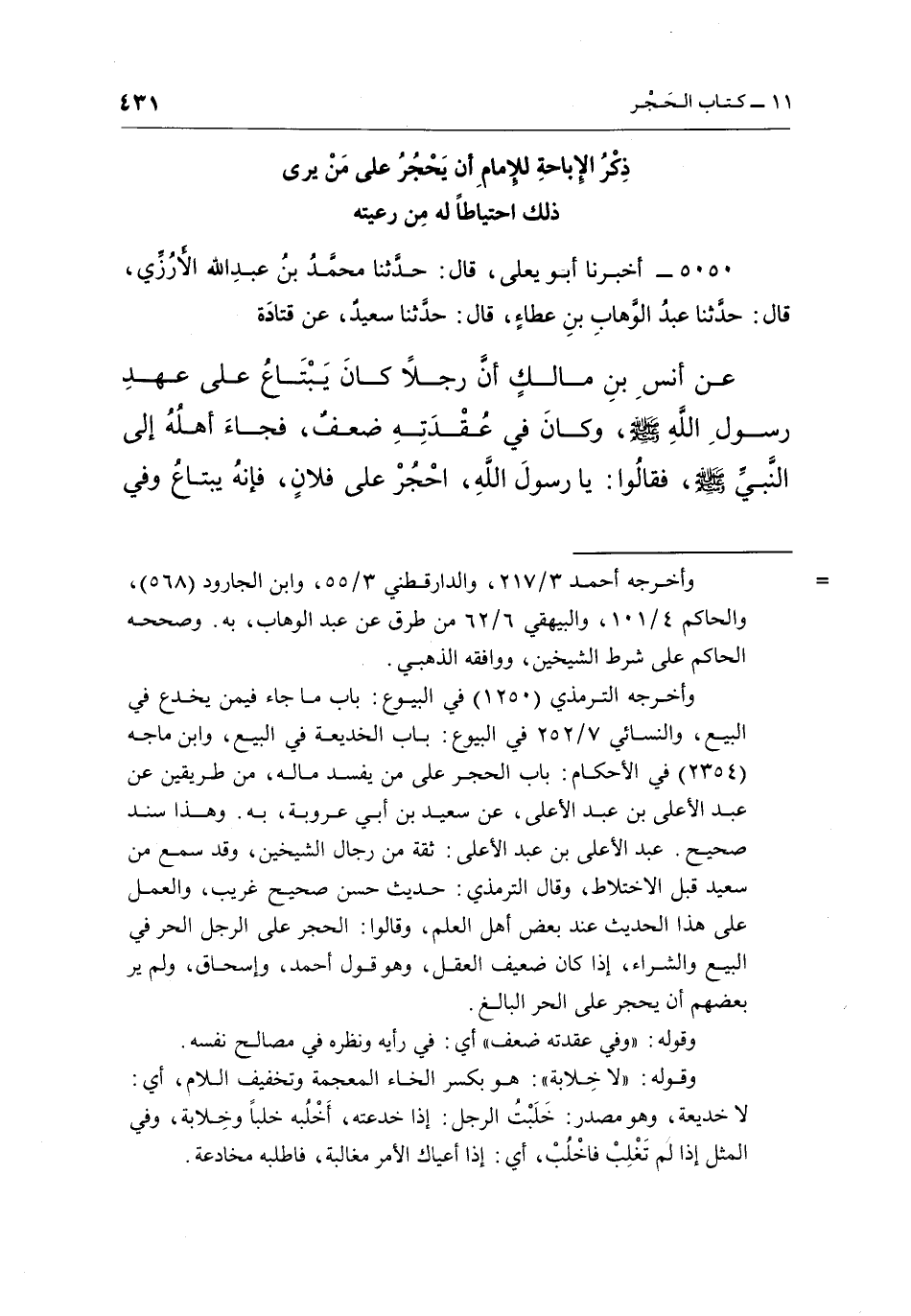 5050 - أَخْبَرَنَا أَبُو يَعْلَى، قَالَ: حَدَّثَنَا مُحَمَّدُ بْنُ عَبْدِ اللَّهِ الْأُرُزِّيُّ، قَالَ: حَدَّثَنَا عَبْدُ الْوَهَّابِ بْنُ عَطَاءٍ، قَالَ: حَدَّثَنَا سَعِيدٌ، عَنْ قَتَادَةَ عَنْ أَنَسِ بْنِ مَالِكٍ أَنَّ رَجُلًا كَانَ يَبْتَاعُ عَلَى عَهْدِ رَسُولِ اللَّهِ صَلَّى اللَّهُ عَلَيْهِ وَسَلَّمَ، وَكَانَ فِي عُقْدَتِهِ ضَعْفٌ، فَجَاءَ أَهْلُهُ إِلَى النَّبِيِّ صَلَّى اللَّهُ عَلَيْهِ وَسَلَّمَ، فَقَالُوا: يَا رَسُولَ الله، احجر على فلان، فإن يبتاع وفي