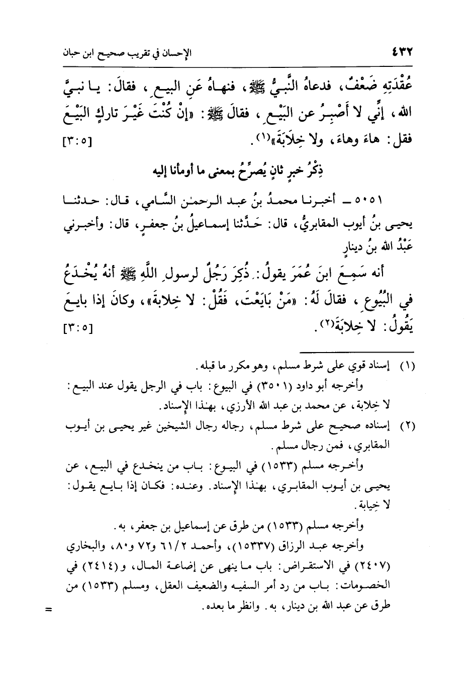 5051 - أَخْبَرَنَا مُحَمَّدُ بْنُ عَبْدِ الرَّحْمَنِ السَّامِيُّ، قَالَ: حَدَّثَنَا يَحْيَى بْنُ أَيُّوبَ الْمَقَابِرِيُّ، قَالَ: حَدَّثَنَا إِسْمَاعِيلُ بْنُ جَعْفَرٍ، قَالَ: وَأَخْبَرَنِي عَبْدُ اللَّهِ بْنُ دِينَارٍ أَنَّهُ سَمِعَ ابْنَ عُمَرَ يَقُولُ: "ذُكِرَ رَجُلٌ لِرَسُولِ اللَّهِ صَلَّى اللَّهُ عَلَيْهِ وَسَلَّمَ أَنَّهُ يُخْدَعُ فِي الْبُيُوعِ، فَقَالَ لَهُ: "مَنْ بَايَعْتَ، فَقُلْ: لَا خِلَابَةَ"، وَكَانَ إذا بايع يقول: لا خلابة1. [3: 5]
