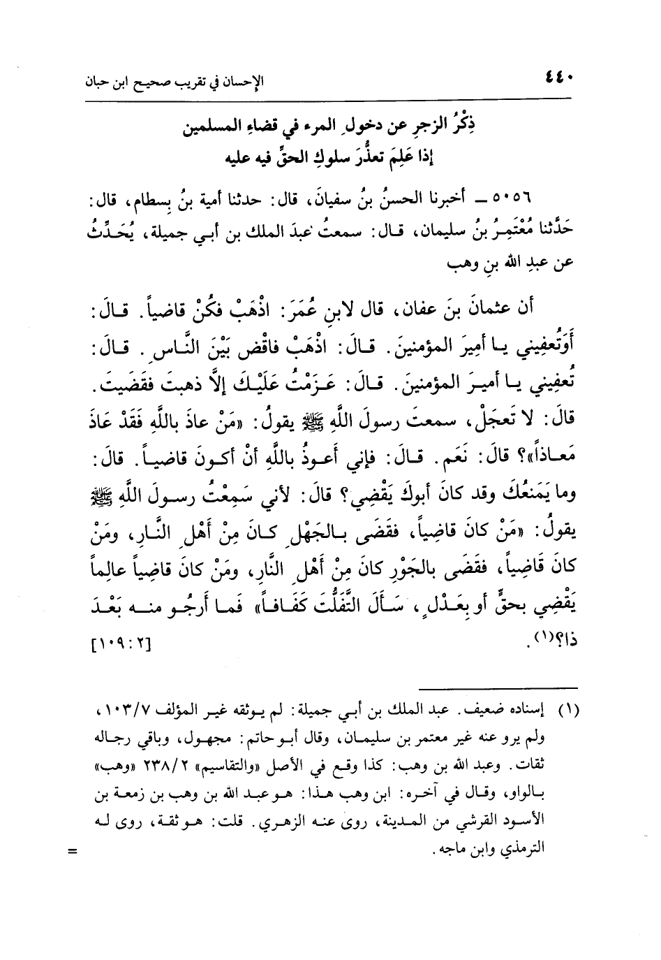 5056 - أَخْبَرَنَا الْحَسَنُ بْنُ سُفْيَانَ، قَالَ: حَدَّثَنَا أُمَيَّةُ بْنُ بِسْطَامٍ، قَالَ: حَدَّثَنَا مُعْتَمِرُ بْنُ سُلَيْمَانَ، قَالَ: سَمِعْتُ عَبْدَ الْمَلِكِ بْنَ أَبِي جَمِيلَةَ، يُحَدِّثُ عَنْ عَبْدِ اللَّهِ بْنِ وَهْبٍ أَنَّ عُثْمَانَ بْنَ عَفَّانَ، قَالَ لِابْنِ عُمَرَ: اذهب فكن قاضيا. قال: أوتعفيني يَا أَمِيرَ الْمُؤْمِنِينَ. قَالَ: اذْهَبْ فَاقْضِ بَيْنَ النَّاسِ. قَالَ: تُعْفِيَنِي يَا أَمِيرَ الْمُؤْمِنِينَ. قَالَ: عَزَمْتُ عَلَيْكَ إِلَّا ذَهَبْتَ فَقَضَيْتَ. قَالَ: لَا تَعْجَلْ، سَمِعْتُ رَسُولَ اللَّهِ صَلَّى اللَّهُ عَلَيْهِ وَسَلَّمَ يَقُولُ: "مَنْ عَاذَ بِاللَّهِ فَقَدْ عَاذَ مَعَاذًا" قَالَ: نَعَمْ. قَالَ: فَإِنِّي أَعُوذُ بِاللَّهِ أَنْ أَكُونَ قَاضِيًا. قَالَ: وَمَا يَمْنَعُكَ وَقَدْ كَانَ أَبُوكَ يَقْضِي قَالَ: لِأَنِّي سَمِعْتُ رَسُولَ اللَّهِ صَلَّى اللَّهُ عَلَيْهِ وَسَلَّمَ يَقُولُ: "مَنْ كَانَ قَاضِيًا، فَقَضَى بِالْجَهْلِ كَانَ مِنْ أَهْلِ النَّارِ، وَمَنْ كَانَ قَاضِيًا، فَقَضَى بِالْجَوْرِ كَانَ مِنْ أَهْلِ النَّارِ، وَمَنْ كَانَ قَاضِيًا عَالِمًا يَقْضِي بِحَقٍّ أَوْ بِعَدْلٍ، سَأَلَ التَّفَلُّتَ كَفَافًا" فما أرجو منه بعد ذا؟ 1. [2: 109]