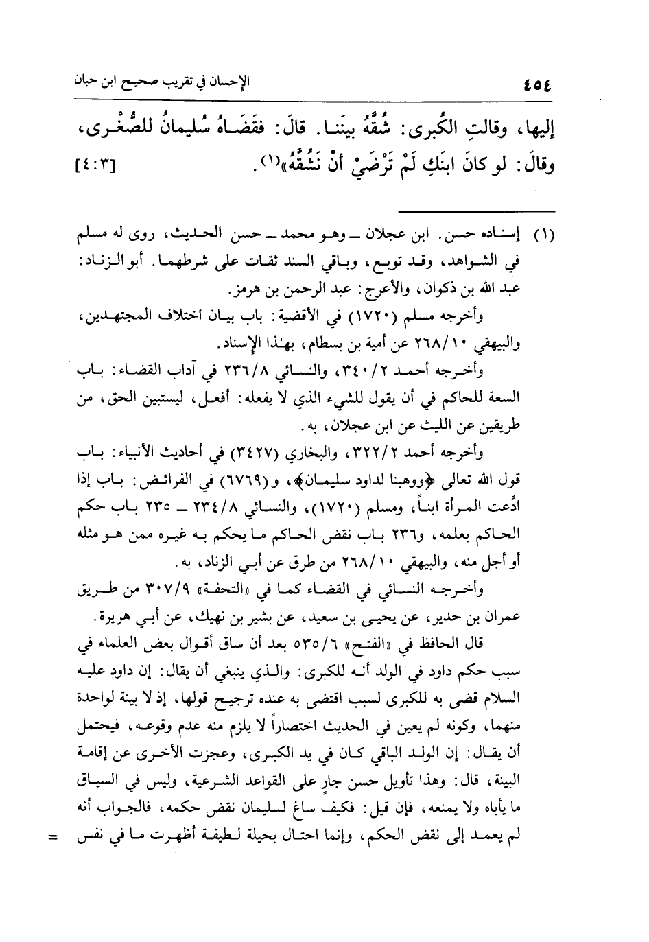 إِلَيْهَا، وَقَالَتِ الْكُبْرَى: شُقَّهُ بَيْنَنَا. قَالَ فَقَضَاهُ سُلَيْمَانُ لِلصُّغْرَى، وَقَالَ: لَوْ كَانَ ابْنَكِ لَمْ ترضي أن نشقه"1. [3: 4]