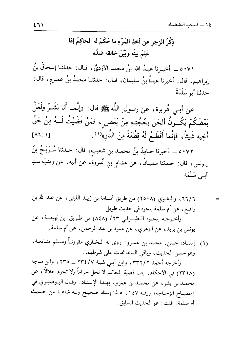 5071 - أَخْبَرَنَا عَبْدُ اللَّهِ بْنُ مُحَمَّدٍ الْأَزْدِيُّ، قَالَ: حَدَّثَنَا إِسْحَاقُ بْنُ إِبْرَاهِيمَ، قَالَ: أَخْبَرَنَا عَبْدَةُ بْنُ سُلَيْمَانَ، قَالَ: حَدَّثَنَا مُحَمَّدُ بْنُ عَمْرٍو، قَالَ: حَدَّثَنَا أَبُو سَلَمَةَ عَنْ أَبِي هُرَيْرَةَ، عَنْ رَسُولِ اللَّهِ صَلَّى اللَّهُ عَلَيْهِ وَسَلَّمَ قَالَ: "إِنَّمَا أَنَا بَشَرٌ وَلَعَلَّ بَعْضَكُمْ يكون ألحن بحجته من بعض، فمن قضيت لَهُ مِنْ حَقِّ أَخِيهِ شَيْئًا، فَإِنَّمَا أَقْطَعُ له قطعة من النار"1. [1: 86]