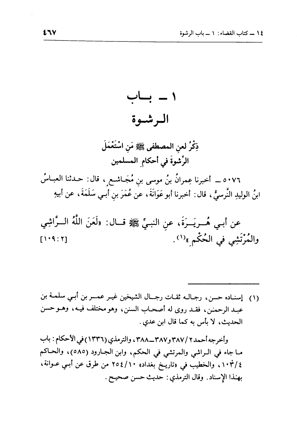 5076 - أَخْبَرَنَا عِمْرَانُ بْنُ مُوسَى بْنِ مُجَاشِعٍ، قَالَ: حَدَّثَنَا الْعَبَّاسُ بْنُ الْوَلِيدِ النَّرْسِيُّ، قَالَ: أَخْبَرَنَا أَبُو عَوَانَةَ، عَنْ عُمَرَ بْنِ أَبِي سَلَمَةَ، عَنْ أَبِيهِ عَنْ أَبِي هُرَيْرَةَ، عَنِ النَّبِيِّ صَلَّى اللَّهُ عَلَيْهِ وَسَلَّمَ قَالَ: "لَعَنَ اللَّهُ الراشي والمرتشي في الحكم"1. [2: 109]
