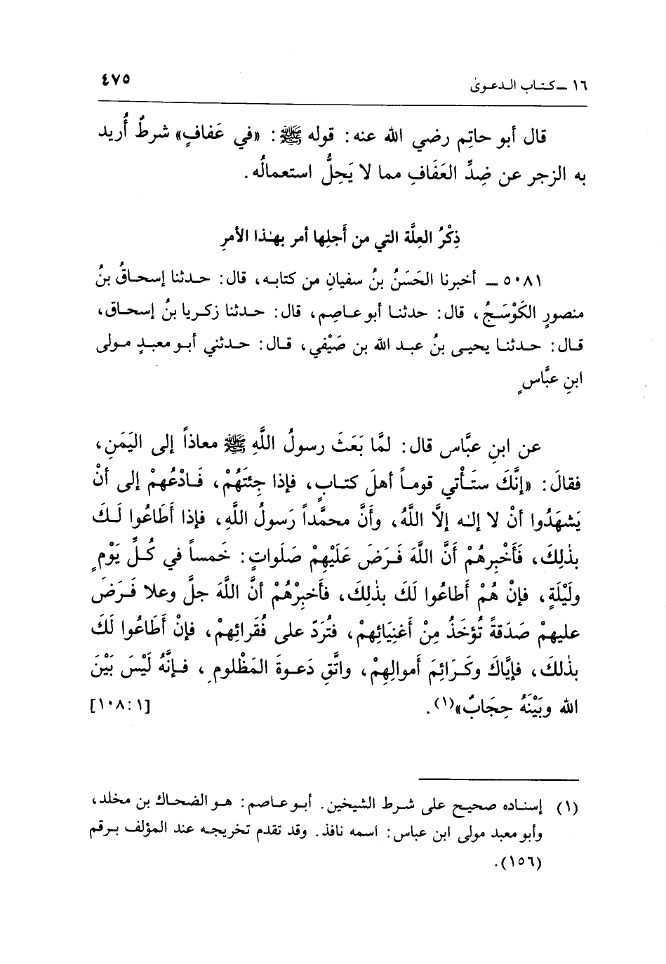 5081 - أَخْبَرَنَا الْحَسَنُ بْنُ سُفْيَانَ مِنْ كِتَابِهِ، قَالَ: حَدَّثَنَا إِسْحَاقُ بْنُ مَنْصُورٍ الْكَوْسَجُ، قَالَ: حَدَّثَنَا أَبُو عَاصِمٍ، قَالَ: حَدَّثَنَا زَكَرِيَّا بْنُ إِسْحَاقَ، قَالَ: حَدَّثَنَا يَحْيَى بْنُ عَبْدِ اللَّهِ بْنِ صَيْفِيٍّ: قَالَ: حَدَّثَنِي أَبُو مَعْبَدٍ مَوْلَى بن عباس عن بن عَبَّاسٍ قَالَ: لَمَّا بَعَثَ رَسُولُ اللَّهِ صَلَّى اللَّهُ عَلَيْهِ وَسَلَّمَ مُعَاذًا إِلَى الْيَمَنِ، فَقَالَ: "إِنَّكَ سَتَأْتِي قَوْمًا أَهْلَ كِتَابٍ، فَإِذَا جِئْتَهُمْ، فَادْعُهُمْ إِلَى أَنْ يَشْهَدُوا أَنَّ لَا إِلَهَ إِلَّا اللَّهُ، وَأَنَّ محمد رَسُولُ اللَّهِ، فَإِذَا أَطَاعُوا لَكَ بِذَلِكَ، فَأَخْبِرْهُمْ أَنَّ اللَّهَ فَرَضَ عَلَيْهِمْ صَلَوَاتٍ: خَمْسًا فِي كُلِّ يَوْمٍ وَلَيْلَةٍ، فَإِنْ هُمْ أَطَاعُوا لَكَ بِذَلِكَ، فَأَخْبِرْهُمْ أَنَّ اللَّهَ جَلَّ وَعَلَا فَرَضَ عَلَيْهِمْ صَدَقَةً تُؤْخَذُ مِنْ أَغْنِيَائِهِمْ، فَتُرَدُّ عَلَى فُقَرَائِهِمْ، فَإِنْ أَطَاعُوا لَكَ بِذَلِكَ، فَإِيَّاكَ وَكَرَائِمَ أَمْوَالِهِمْ، وَاتَّقِ دَعْوَةَ الْمَظْلُومِ، فَإِنَّهُ لَيْسَ بَيْنَ الله وبينه حجاب "1. [1: 108]