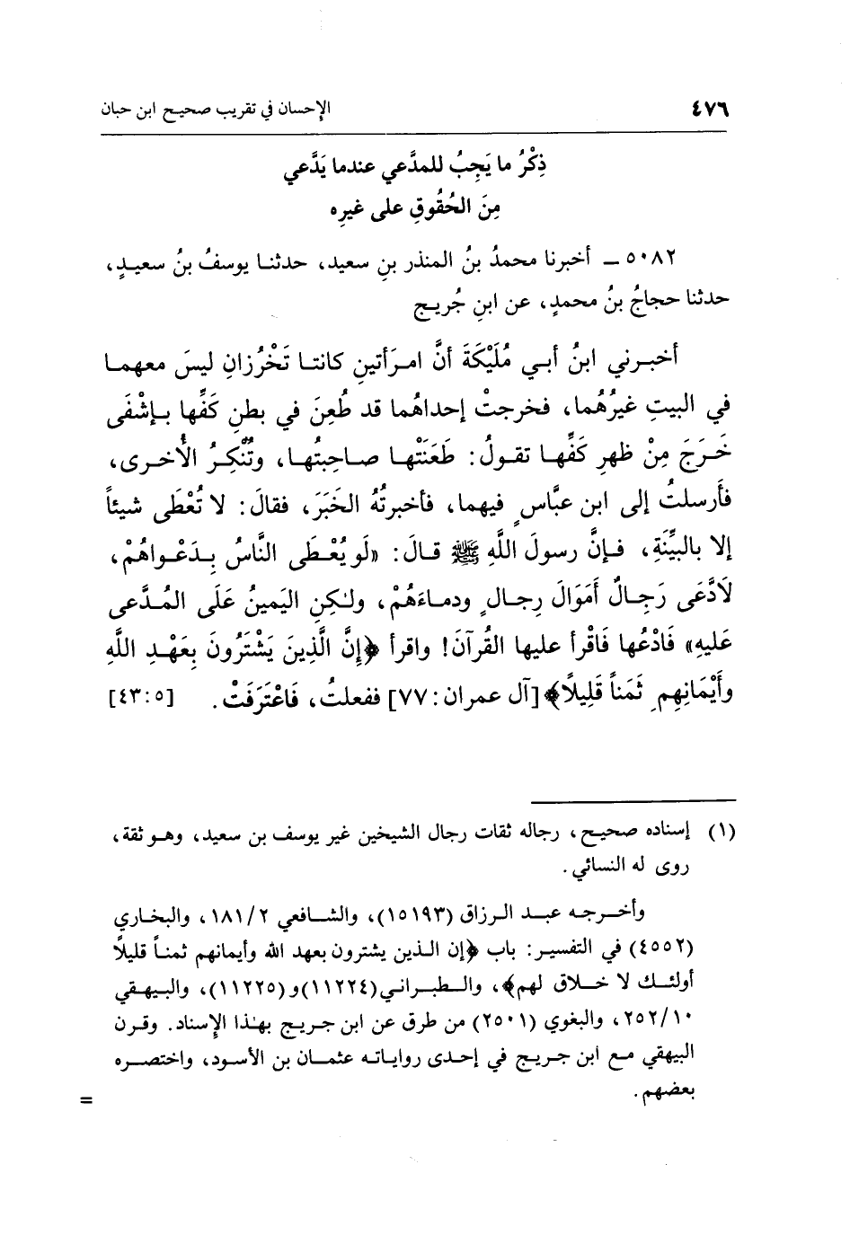 5082 - أَخْبَرَنَا مُحَمَّدُ بْنُ الْمُنْذِرِ بْنِ سَعِيدٍ، حَدَّثَنَا يُوسُفُ بْنُ سَعِيدٍ، حَدَّثَنَا حجاج بن محمد، عن بن جريج أخبرني بن أَبِي مُلَيْكَةَ أَنَّ امْرَأَتَيْنِ كَانَتَا تَخْرُزَانِ لَيْسَ مَعَهُمَا فِي الْبَيْتِ غَيْرَهُمَا، فَخَرَجَتْ إِحْدَاهُمَا قَدْ طُعِنَ فِي بَطْنِ كَفِّهَا بِإِشْفَى خَرَجَ مِنْ ظَهْرِ كَفِّهَا تَقُولُ: طَعَنَتْهَا صَاحِبَتُهَا، وَتُنْكِرُ الْأُخْرَى، فأرسلت إلى بن عَبَّاسٍ فِيهِمَا، فَأَخْبَرَتْهُ الْخَبَرَ، فَقَالَ: لَا تُعْطِي شَيْئًا إِلَّا بِالْبَيِّنَةِ، فَإِنَّ رَسُولَ اللَّهِ صَلَّى اللَّهُ عَلَيْهِ وَسَلَّمَ قَالَ: "لَوْ يُعْطَى النَّاسُ بِدَعْوَاهُمْ، لَادَّعَى رِجَالٌ أَمْوَالَ رِجَالٍ وَدِمَاءَهُمْ، وَلَكِنَّ الْيَمِينَ عَلَى الْمُدَّعَى عَلَيْهِ" فَادْعُهَا فَاقْرَأْ عَلَيْهَا الْقُرْآنَ! وَاقْرَأْ {إِنَّ الَّذِينَ يَشْتَرُونَ بِعَهْدِ اللَّهِ وَأَيْمَانِهِمْ ثَمَناً قَلِيلاً} . [آل عمران: 77] 1 فَفَعَلْتُ، فَاعْتَرَفَتْ. [5: 43]