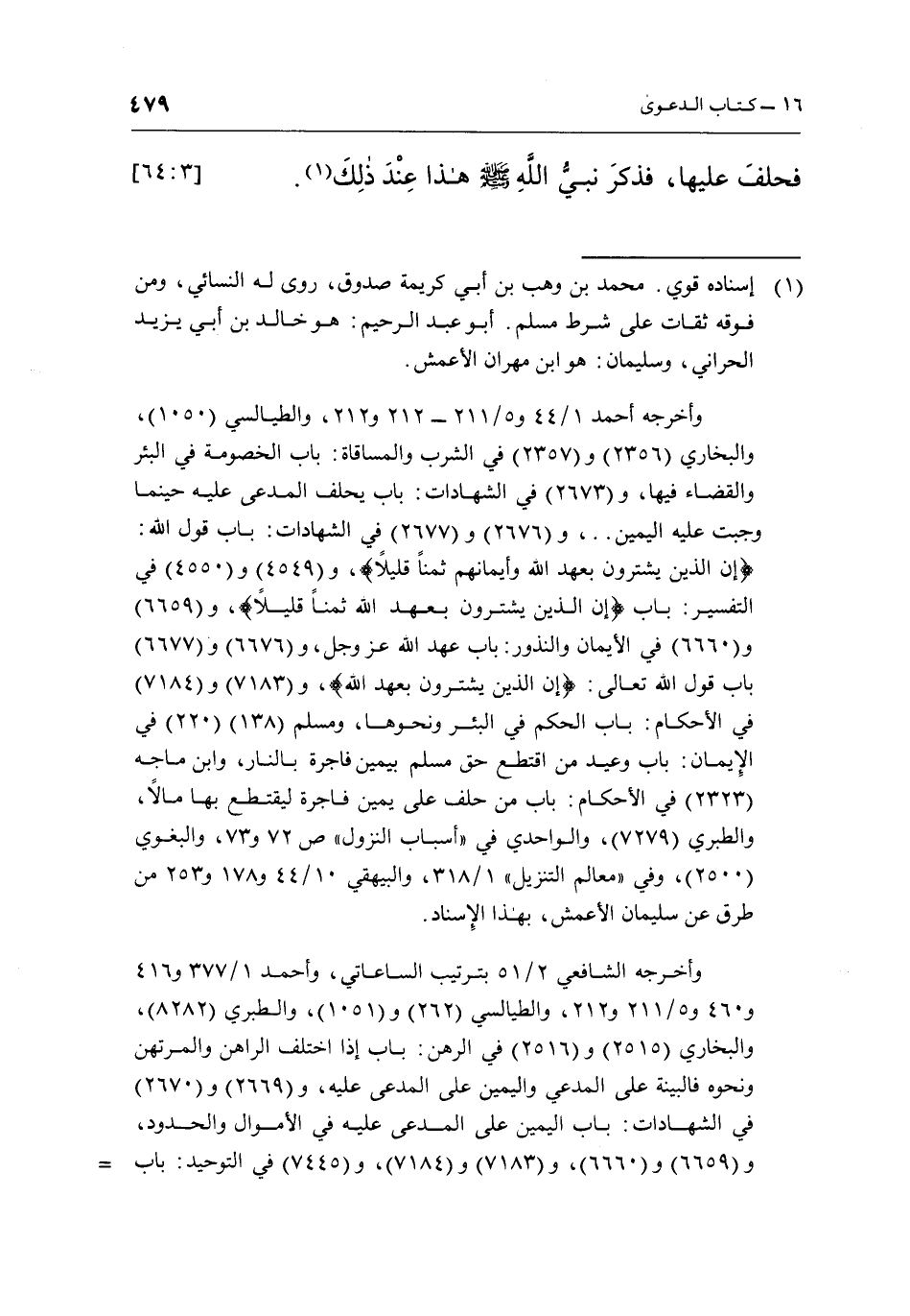 فَحَلَفَ عَلَيْهَا، فَذَكَرَ نَبِيُّ اللَّهِ صَلَّى اللَّهُ عليه وسلم هذا عند ذلك1. [3: 64]