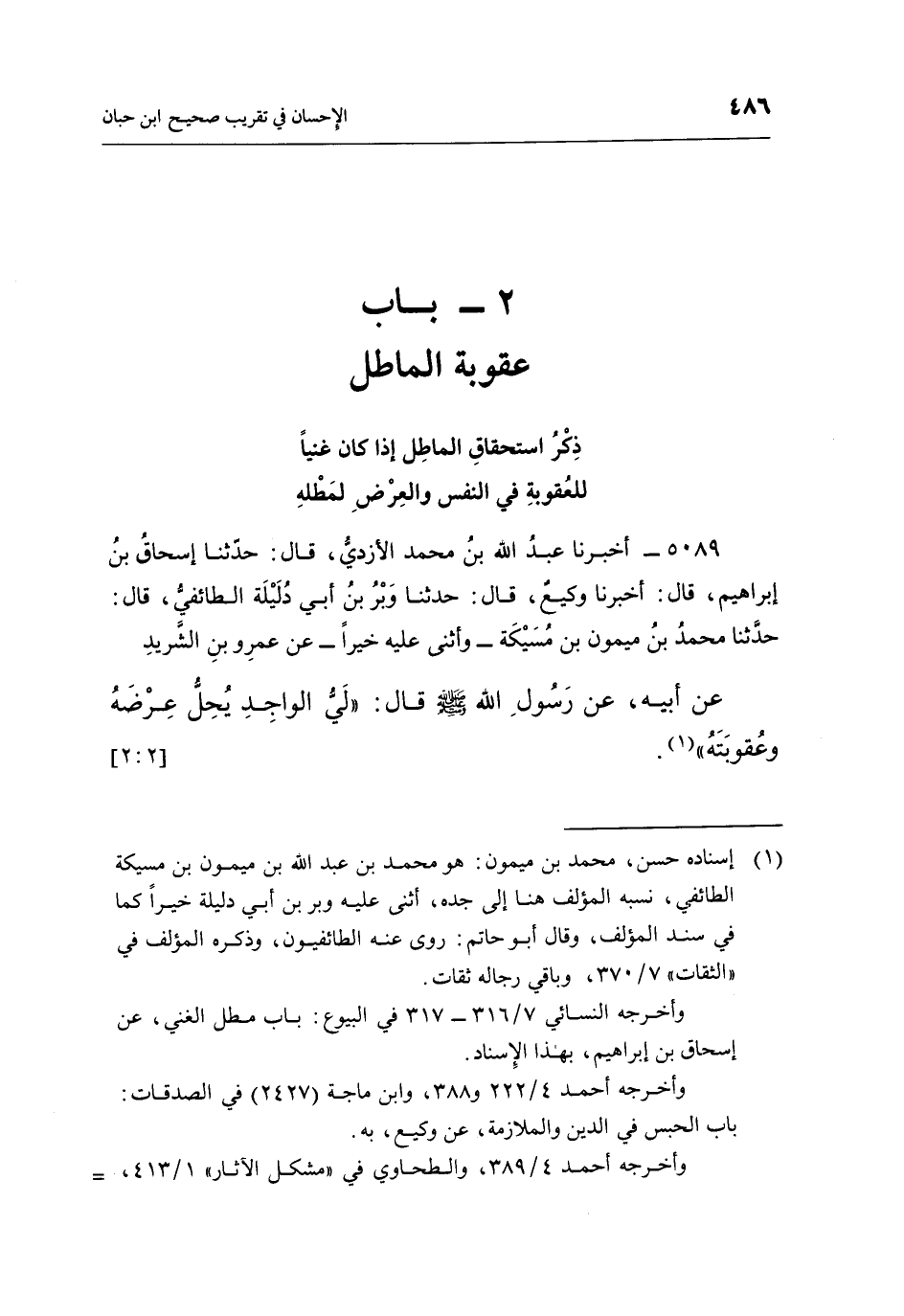 5089 - أَخْبَرَنَا عَبْدُ اللَّهِ بْنُ مُحَمَّدٍ الْأَزْدِيُّ، قَالَ: حَدَّثَنَا إِسْحَاقُ بْنُ إِبْرَاهِيمَ قَالَ: أَخْبَرَنَا وَكِيعٌ، قَالَ: حَدَّثَنَا وَبْرُ بْنُ أَبِي دُلَيْلَةَ الطَّائِفِيُّ، قَالَ: حَدَّثَنَا مُحَمَّدُ بْنُ مَيْمُونِ بْنِ مُسَيْكَةَ - وَأَثْنَى عَلَيْهِ خَيْرًا - عَنْ عَمْرِو بْنِ الشَّرِيدِ عَنْ أَبِيهِ، عَنْ رَسُولِ اللَّهِ صَلَّى اللَّهُ عَلَيْهِ وَسَلَّمَ قَالَ: "لِي الْوَاجِدُ يُحِلُّ عِرْضُهُ وعقوبته"1. [2: 2]