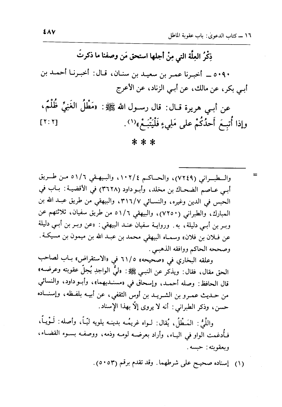5090 - أَخْبَرَنَا عُمَرُ بْنُ سَعِيدِ بْنِ سِنَانٍ، قَالَ: أَخْبَرَنَا أَحْمَدُ بْنُ أَبِي بَكْرٍ، عَنْ مَالِكٍ، عَنْ أَبِي الزِّنَادِ، عَنِ الْأَعْرَجِ عَنْ أَبِي هُرَيْرَةَ قَالَ: قَالَ رَسُولُ اللَّهِ صَلَّى اللَّهُ عَلَيْهِ وَسَلَّمَ: "مَطْلُ الْغَنِيِّ ظُلْمٌ، وَإِذَا أُتْبِعَ أَحَدُكُمْ عَلَى مَلِيءٍ فَلْيَتْبَعْ"1. [2: 2]