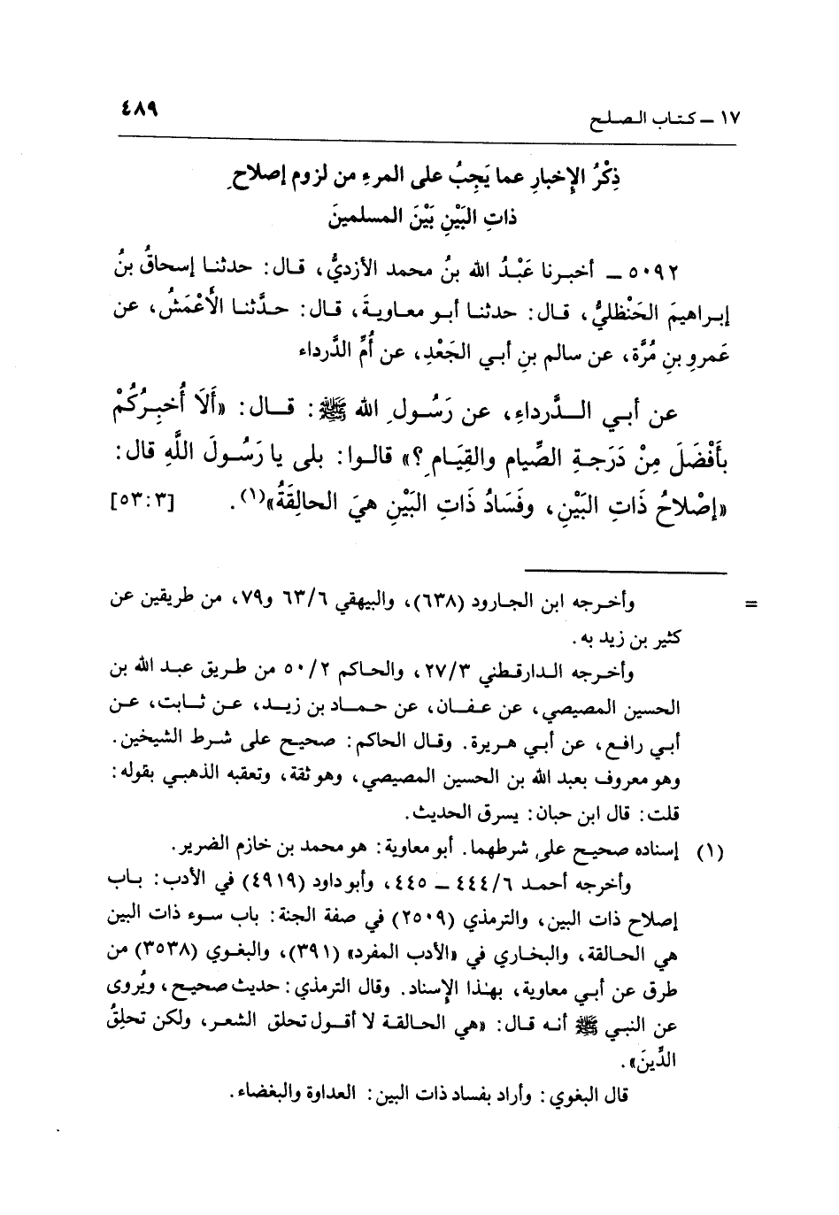 5092 - أَخْبَرَنَا عَبْدُ اللَّهِ بْنُ مُحَمَّدٍ الْأَزْدِيُّ، قَالَ: حَدَّثَنَا إِسْحَاقُ بْنُ إِبْرَاهِيمَ الْحَنْظَلِيُّ، قَالَ: حَدَّثَنَا أَبُو مُعَاوِيَةَ، قَالَ: حَدَّثَنَا الْأَعْمَشُ، عَنْ عَمْرِو بْنِ مُرَّةَ، عَنْ سَالِمِ بْنِ أَبِي الْجَعْدِ، عَنْ أُمِّ الدَّرْدَاءِ عَنْ أَبِي الدَّرْدَاءِ، عَنِ رَسُولِ اللَّهِ صَلَّى اللَّهُ عَلَيْهِ وَسَلَّمَ قَالَ: "أَلَا أُخْبِرُكُمْ بِأَفْضَلَ مِنْ دَرَجَةِ الصِّيَامِ وَالْقِيَامِ؟ " قَالُوا: بَلَى يَا رَسُولَ اللَّهِ قَالَ: "إِصْلَاحُ ذَاتِ البين، وفساد ذات البين هي الحالقة" 1. [3: 53]