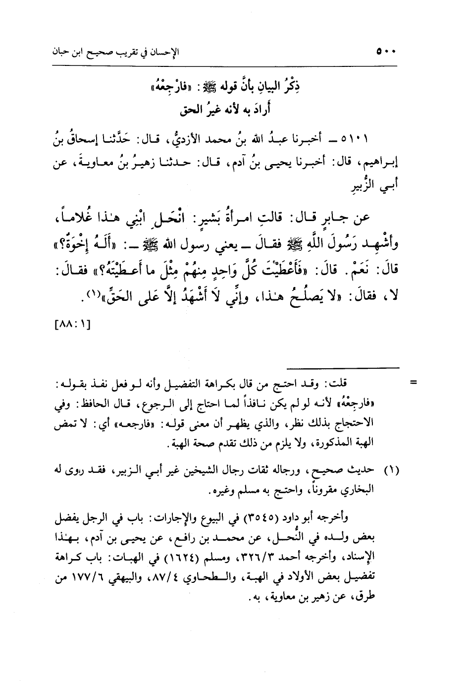 5101 - أَخْبَرَنَا عَبْدُ اللَّهِ بْنُ مُحَمَّدٍ الْأَزْدِيُّ، قَالَ: حَدَّثَنَا إِسْحَاقُ بْنُ إِبْرَاهِيمَ، قَالَ: أَخْبَرَنَا يَحْيَى بْنُ آدَمَ، قَالَ: حَدَّثَنَا زُهَيْرُ بْنُ مُعَاوِيَةَ، عَنْ أَبِي الزُّبَيْرِ عَنْ جَابِرٍ قَالَ: قَالَتِ: امْرَأَةُ بَشِيرٍ: انْحَلِ ابْنِي هَذَا غُلَامًا، وَأَشْهِدْ رسول الله صلى الله عليه وسلم فقال - يَعْنِي رَسُولَ اللَّهِ صَلَّى اللَّهُ عَلَيْهِ وَسَلَّمَ - "أَلَهُ إِخْوَةٌ؟ " قَالَ: نَعَمْ. قَالَ: "فَأَعْطَيْتُ كُلَّ وَاحِدٍ مِنْهُمْ مِثْلَ مَا أَعْطَيْتُهُ؟ " فَقَالَ: لَا، فَقَالَ: "لَا يَصْلُحُ هَذَا، وَإِنِّي لَا أَشْهَدُ إلا على الحق"1. [1: 88]