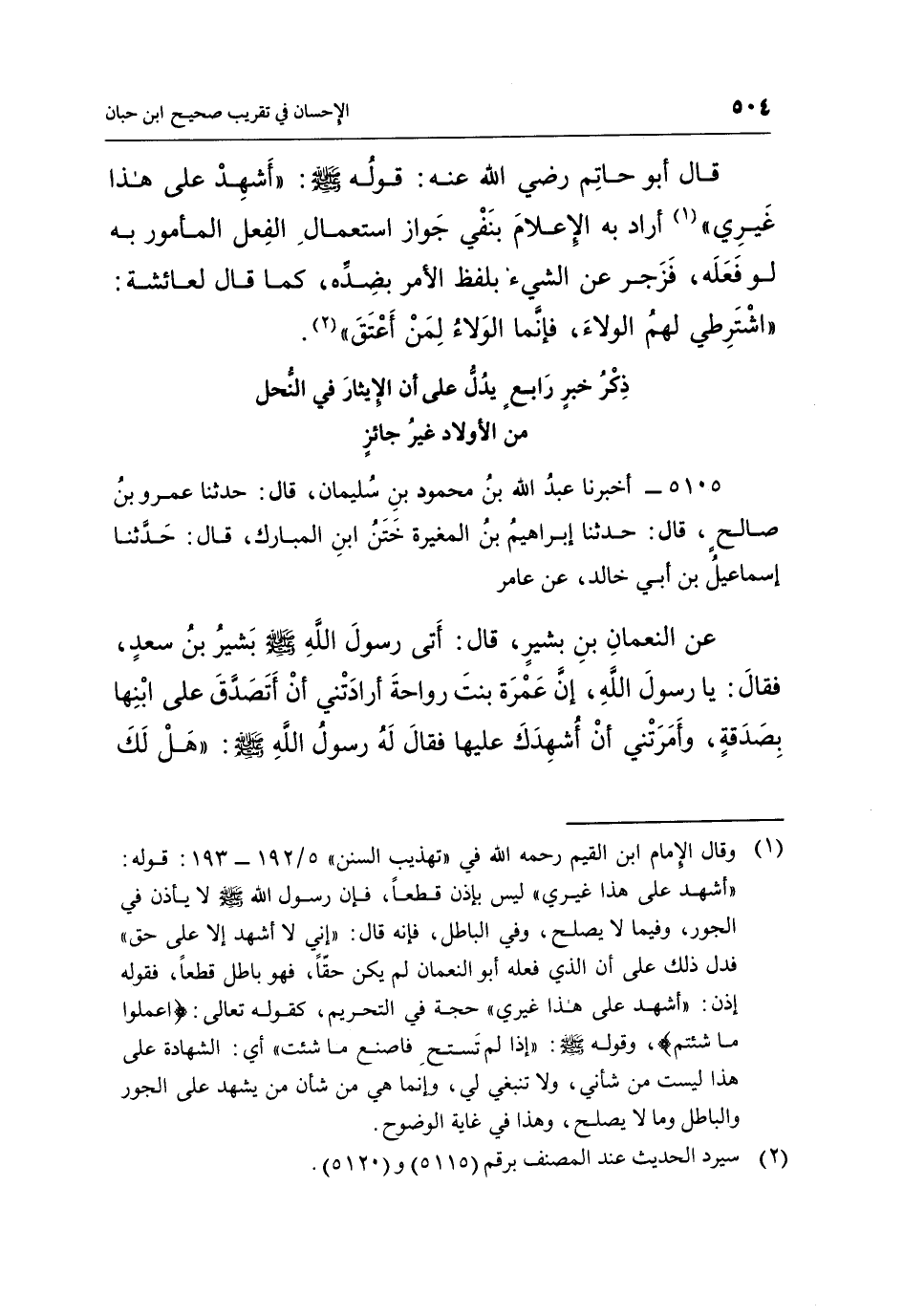 1 وقال الإمام ابن القيم رحمه الله في "تهذيب السنن" 5/192 - 193: قوله: "وأشهد على هذا غيري" ليس بإذن قطعاً، فَإِنَّ رَسُولَ اللَّهِ صَلَّى اللَّهُ عَلَيْهِ وَسَلَّمَ لايأذن في الجور، وفيما لا يصلح، وفي الباطل، فإنه قال: "إني لاأشهد إلا على حق" فدل ذلك على أن الذي فعله أبو النعمان لم يكن حقاً، فهو باطل قطعاً، فقوله إذن: "أشهد على هذا غيري" حجة في التحريم، كقوله تعالى: {اعْمَلُوا مَا شِئْتُمْ} ، وقوله صلى الله عليه وسلم: "إذا لم تستح فاصنع ماشئت" أي: الشهادة على هذا ليست من شأني، ولاتنبغي لي، وإنما هي من شأن من يشهد على الجور والباطل وما لا يصلح، وهذا في غاية الوضوح.