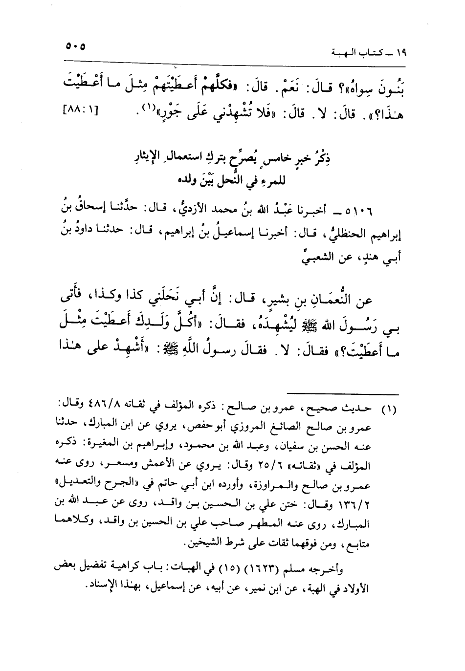 5105 - أَخْبَرَنَا عَبْدُ اللَّهِ بْنُ مَحْمُودِ بْنِ سُلَيْمَانَ، قَالَ: حَدَّثَنَا عَمْرُو بْنُ صَالِحٍ، قَالَ: حَدَّثَنَا إِبْرَاهِيمُ بن المغيرة ختن بن الْمُبَارَكِ، قَالَ: حَدَّثَنَا إِسْمَاعِيلُ بْنُ أَبِي خَالِدٍ، عَنْ عَامِرٍ عَنِ النُّعْمَانِ بْنِ بَشِيرٍ، قَالَ: أَتَى رَسُولَ اللَّهِ صَلَّى اللَّهُ عَلَيْهِ وَسَلَّمَ بَشِيرَ بْنَ سَعْدٍ، فَقَالَ: يَا رَسُولَ اللَّهِ، إِنَّ عَمْرَةَ بِنْتَ رَوَاحَةَ أَرَادَتْنِي أَنْ أَتَصَدَّقَ عَلَى ابْنِهَا بِصَدَقَةٍ، وَأَمَرَتْنِي أَنْ أُشْهِدَكَ عَلَيْهَا فَقَالَ لَهُ رَسُولُ اللَّهِ صَلَّى اللَّهُ عَلَيْهِ وَسَلَّمَ: "هَلْ لَكَ بَنُونَ سِوَاهُ"؟ قَالَ: نَعَمْ. قَالَ: "فَكُلُّهُمْ أَعْطَيْتَهُمْ مِثْلَ مَا أَعْطَيْتَ هَذَا؟ ". قَالَ لَا:. قَالَ: "فَلَا تُشْهِدْنِي عَلَى جَوْرٍ"1.