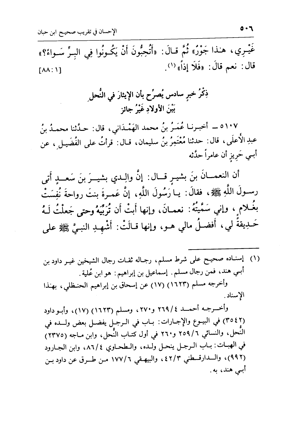 ذِكْرُ خَبَرٍ خَامِسٍ يُصَرِّحُ بِتَرْكِ اسْتِعْمَالِ الْإِيثَارِ لِلْمَرْءِ فِي النَّحْلِ بَيْنَ وَلَدِهِ