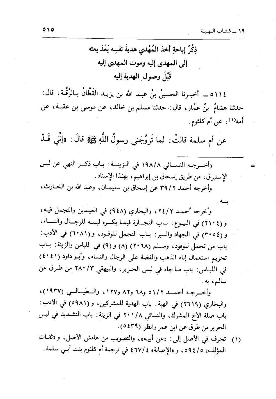 5114 - أَخْبَرَنَا الْحُسَيْنُ بْنُ عَبْدِ اللَّهِ بْنِ يَزِيدَ الْقَطَّانُ بِالرَّقَّةِ، قَالَ: حَدَّثَنَا هِشَامُ بْنُ عَمَّارٍ، قَالَ: حَدَّثَنَا مُسْلِمُ بْنُ خَالِدٍ، عَنْ مُوسَى بْنِ عُقْبَةَ، عَنْ أُمِّهِ1، عَنْ أُمِّ كُلْثُومٍ. عَنْ أُمِّ سَلَمَةَ قَالَتْ: لَمَّا تَزَوَّجَنِي رَسُولُ اللَّهِ صَلَّى اللَّهُ عَلَيْهِ وَسَلَّمَ قال: "إني قد