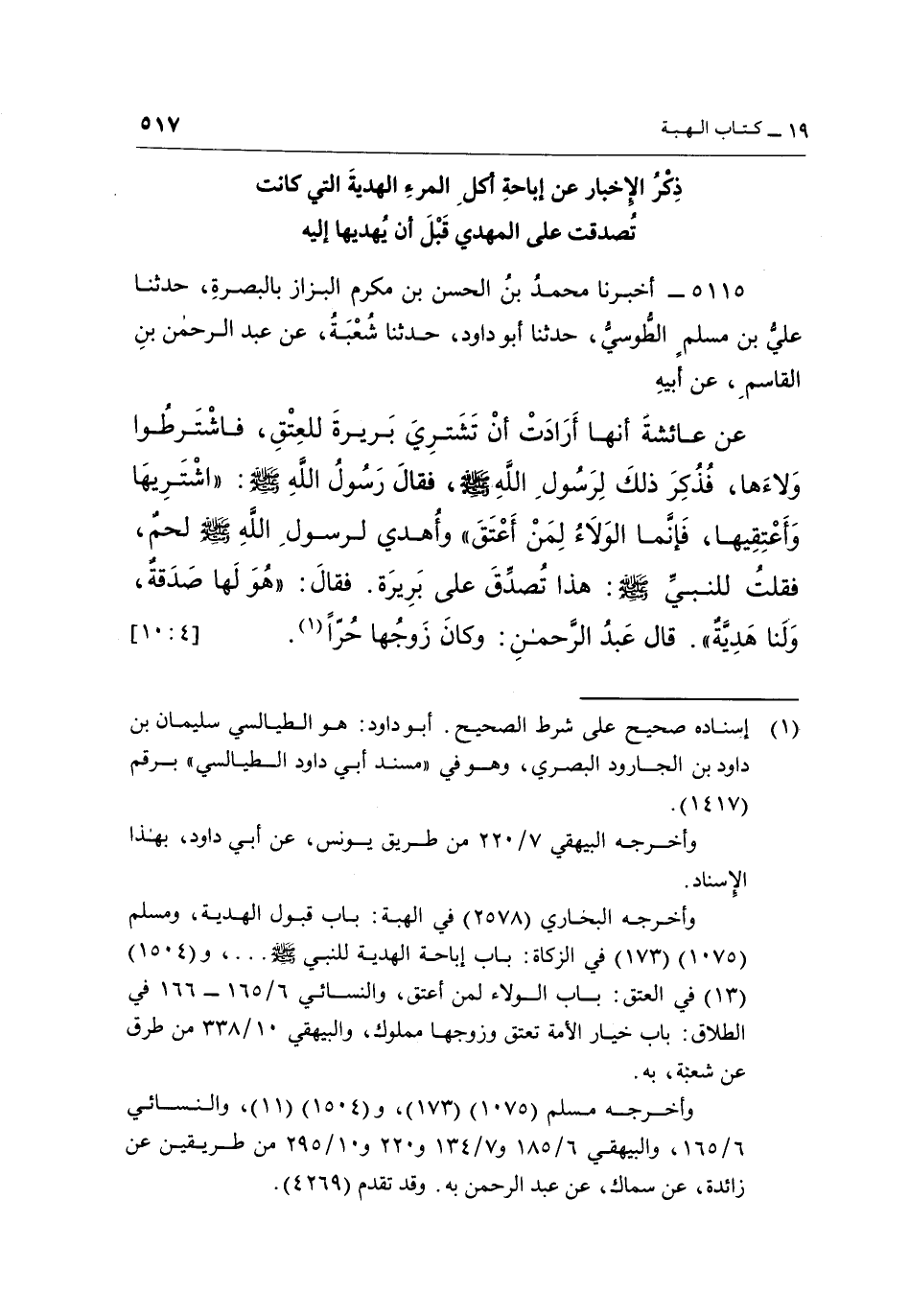 5115 - أَخْبَرَنَا مُحَمَّدُ بْنُ الْحَسَنِ بْنِ مُكْرَمٍ الْبَزَّازُ بِالْبَصْرَةِ، حَدَّثَنَا عَلِيُّ بْنُ مُسْلِمٍ الطُّوسِيُّ، حَدَّثَنَا أَبُو دَاوُدَ، حَدَّثَنَا شُعْبَةُ، عَنْ عَبْدِ الرَّحْمَنِ بْنِ الْقَاسِمِ، عَنْ أَبِيهِ عَنْ عَائِشَةَ أَنَّهَا أَرَادَتْ أَنْ تَشْتَرِيَ بَرِيرَةَ لِلْعِتْقِ، فَاشْتَرَطُوا وَلَاءَهَا، فَذُكِرَ ذَلِكَ لِرَسُولِ اللَّهِ صَلَّى اللَّهُ عَلَيْهِ وَسَلَّمَ، فقَالَ: رَسُولُ اللَّهِ صَلَّى اللَّهُ عَلَيْهِ وَسَلَّمَ: "اشْتَرِيهَا وَأَعْتِقِيهَا، فَإِنَّمَا الْوَلَاءُ لِمَنْ أَعْتَقَ" وَأَهْدَى لِرَسُولِ اللَّهِ صَلَّى اللَّهُ عَلَيْهِ وَسَلَّمَ لَحْمٌ، فَقُلْتُ لِلنَّبِيِّ صَلَّى اللَّهُ عَلَيْهِ وَسَلَّمَ: هَذَا تُصُدِّقَ عَلَى بَرِيرَةَ. فَقَالَ: "هُوَ لَهَا صَدَقَةٌ، وَلَنَا هَدِيَّةٌ" قَالَ عَبْدُ الرحمن: وكان زوجها حرا1. [4: 1]