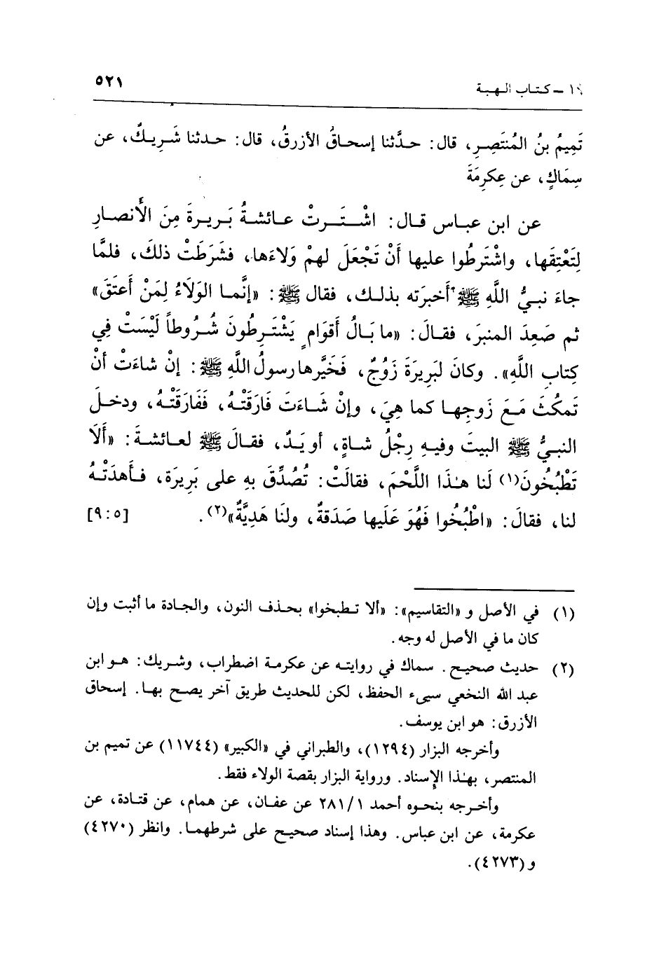 5120 - أَخْبَرَنَا عُمَرُ بْنُ مُحَمَّدِ بْنِ بُجَيْرٍ الْهَمْدَانِيُّ، قال: حدثناتميم بْنُ الْمُنْتَصِرِ، قَالَ: حَدَّثَنَا إِسْحَاقُ الْأَزْرَقُ، قَالَ: حَدَّثَنَا شَرِيكٌ، عَنْ سِمَاكٍ عَنْ عِكْرِمَةَ عَنِ بن عَبَّاسٍ قَالَ: اشْتَرَتْ عَائِشَةُ بَرِيرَةَ مِنَ الْأَنْصَارِ لِتُعْتِقَهَا، وَاشْتَرَطُوا عَلَيْهَا أَنْ تَجْعَلَ لَهُمْ وَلَاءَهَا، فَشَرَطَتْ ذَلِكَ، فَلَمَّا جَاءَ نَبِيُّ اللَّهِ صَلَّى اللَّهُ عَلَيْهِ وَسَلَّمَ أَخْبَرَتْهُ بِذَلِكَ، فَقَالَ صَلَّى اللَّهُ عَلَيْهِ وَسَلَّمَ: "إِنَّمَا الْوَلَاءُ لِمَنْ أَعْتَقَ" ثُمَّ صَعِدَ الْمِنْبَرَ، فَقَالَ: "مَا بَالُ أَقْوَامٍ يَشْتَرِطُونَ شُرُوطًا لَيْسَتْ فِي كِتَابِ اللَّهِ". وَكَانَ لِبَرِيرَةَ زَوْجٌ، فَخَيَّرَهَا رَسُولُ اللَّهِ صَلَّى اللَّهُ عَلَيْهِ وَسَلَّمَ: إِنْ شَاءَتْ أَنْ تَمْكُثَ مَعَ زَوْجِهَا كَمَا هِيَ، وَإِنْ شَاءَتْ فَارَقَتْهُ، فَفَارَقَتْهُ، وَدَخَلَ النَّبِيُّ صَلَّى اللَّهُ عَلَيْهِ وَسَلَّمَ الْبَيْتَ وَفِيهِ رِجْلُ شَاةٍ، أَوْ يَدٍ، فَقَالَ صَلَّى اللَّهُ عَلَيْهِ وَسَلَّمَ لِعَائِشَةَ: "أَلَا تَطْبُخُونَ1 لَنَا هَذَا اللَّحْمَ"، فَقَالَتْ: تُصُدِّقَ بِهِ عَلَى بَرِيرَةَ، فَأَهْدَتْهُ لَنَا، فَقَالَ: "اطْبُخُوا فَهُوَ عَلَيْهَا صَدَقَةٌ ولنا هدية"2. [5: 9]