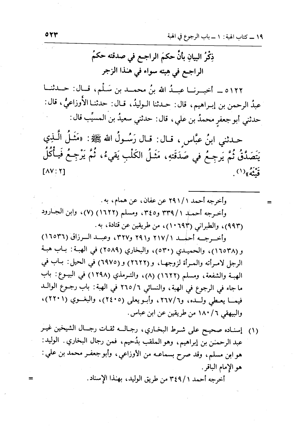 5122 - أَخْبَرَنَا عَبْدُ اللَّهِ بْنُ مُحَمَّدِ بْنِ سَلْمٍ، قَالَ: حَدَّثَنَا عَبْدُ الرَّحْمَنِ بْنُ إِبْرَاهِيمَ، قَالَ: حَدَّثَنَا الْوَلِيدُ، قَالَ: حَدَّثَنَا الْأَوْزَاعِيُّ، قَالَ: حَدَّثَنِي أَبُو جَعْفَرٍ مُحَمَّدُ بْنُ عَلِيٍّ، قَالَ: حدثني سعيد بن المسيب قال: حدثني بْنِ عَبَّاسٍ، قَالَ: قَالَ رَسُولُ اللَّهِ صَلَّى اللَّهُ عَلَيْهِ وَسَلَّمَ: "مَثَلُ الَّذِي يَتَصَدَّقُ ثُمَّ يَرْجِعُ فِي صَدَقَتِهِ، مَثَلُ الْكَلْبِ يَقِيءُ ثُمَّ يَرْجِعُ فيأكل قيئه"1. [2: 78]