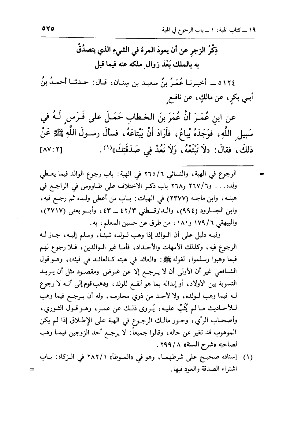 5124 - أَخْبَرَنَا عُمَرُ بْنُ سَعِيدِ بْنِ سِنَانٍ، قَالَ: حَدَّثَنَا أَحْمَدُ بْنُ أَبِي بَكْرٍ، عَنْ مَالِكٍ عن نافع عن بن عُمَرَ أَنَّ عُمَرَ بْنَ الْخَطَّابِ حَمَلَ عَلَى فَرَسٍ لَهُ فِي سَبِيلِ اللَّهِ، فَوَجَدَهُ يُبَاعُ، فَأَرَادَ أَنْ يَبْتَاعَهُ، فَسَأَلَ رَسُولَ اللَّهِ صَلَّى اللَّهُ عَلَيْهِ وَسَلَّمَ عَنْ ذَلِكَ، فَقَالَ: "لَا تبتعه، ولا تعد في صدقتك"1. [2: 78]