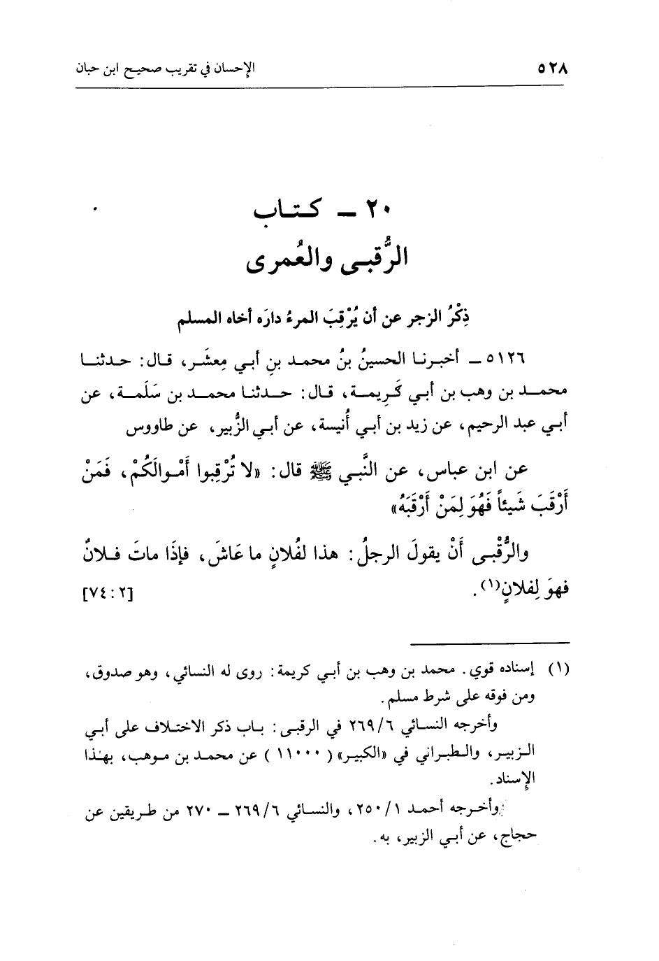 5126 - أَخْبَرَنَا الْحُسَيْنُ بْنُ مُحَمَّدِ بْنِ أَبِي مَعْشَرٍ، قَالَ: حَدَّثَنَا مُحَمَّدُ بْنُ وَهْبِ بْنِ أَبِي كَرِيمَةَ، قَالَ: حَدَّثَنَا مُحَمَّدُ بْنُ سَلَمَةَ، عَنْ أَبِي عَبْدِ الرَّحِيمِ، عَنْ زَيْدِ بْنِ أَبِي أُنَيْسَةَ، عَنْ أَبِي الزبير، عن طاوس عن بن عَبَّاسٍ، عَنِ النَّبِيِّ صَلَّى اللَّهُ عَلَيْهِ وَسَلَّمَ قَالَ: "لَا تُرْقِبُوا أَمْوَالَكُمْ، فَمَنْ أَرْقَبَ شَيْئًا فَهُوَ لِمَنْ أَرْقَبَهُ" وَالرُّقْبَى أَنْ يَقُولَ: الرَّجُلُ: هَذَا لِفُلَانٍ مَا عَاشَ، فَإِذَا مَاتَ فُلَانٌ فهو لفلان1. [2: 74]