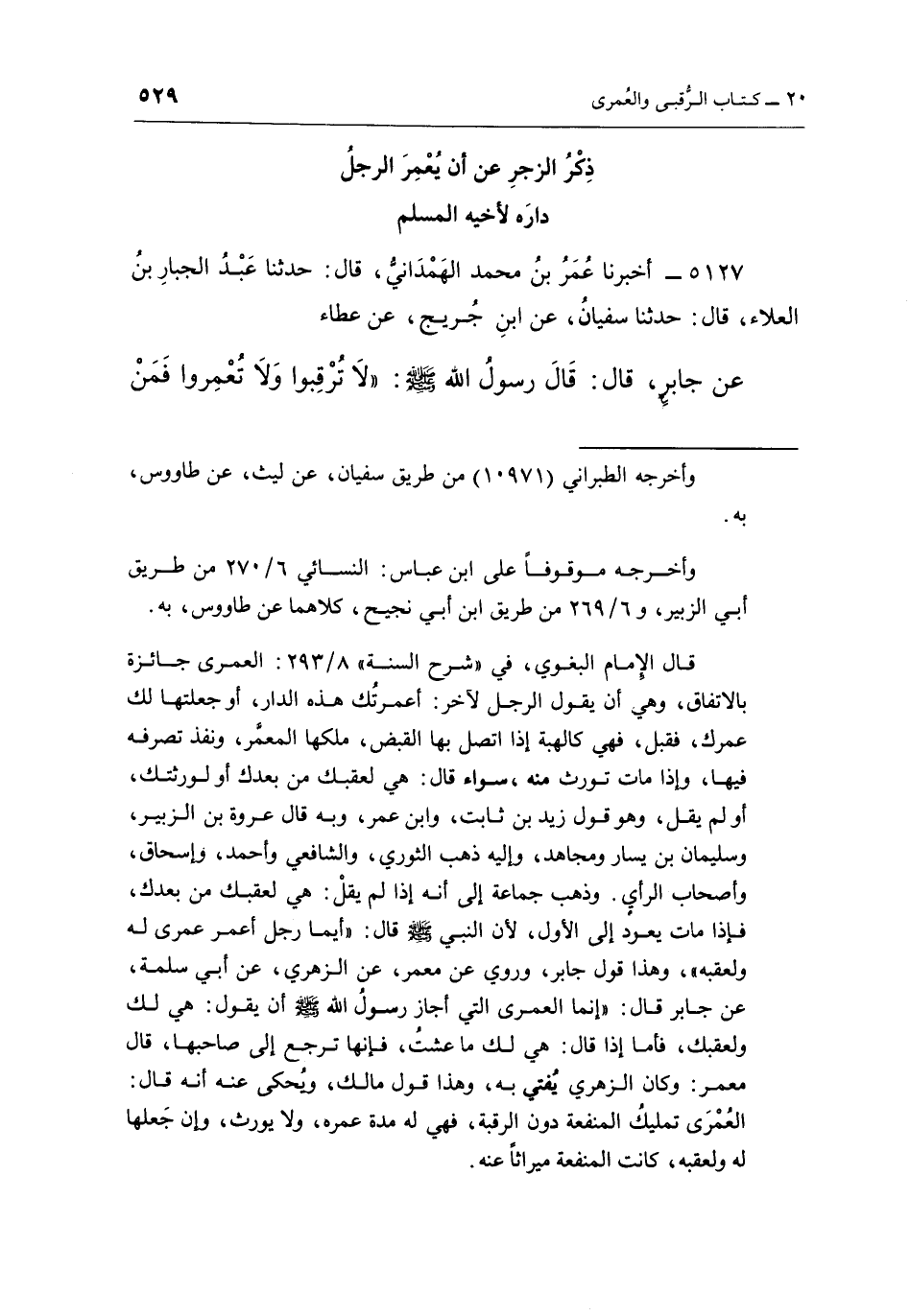 5127 - أَخْبَرَنَا عُمَرُ بْنُ مُحَمَّدٍ الْهَمْدَانِيُّ، قَالَ: حَدَّثَنَا عَبْدُ الْجَبَّارِ بْنُ الْعَلَاءِ، قَالَ: حَدَّثَنَا سُفْيَانُ، عن بن جُرَيْجٍ، عَنْ عَطَاءٍ عَنْ جَابِرٍ، قَالَ: قَالَ رَسُولُ اللَّهِ صَلَّى اللَّهُ عَلَيْهِ وَسَلَّمَ: "لَا تُرْقِبُوا وَلَا تُعْمِرُوا فَمَنْ