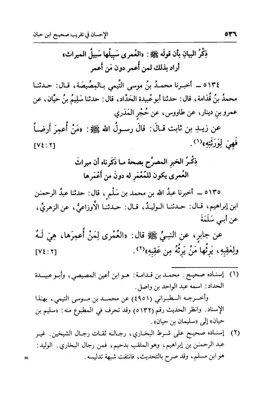 5134 - أَخْبَرَنَا مُحَمَّدُ بْنُ مُوسَى التَّيْمِيُّ بِالْمَصِّيصَةِ، قَالَ: حَدَّثَنَا مُحَمَّدُ بْنُ قُدَامَةَ، قَالَ: حَدَّثَنَا أَبُو عُبَيْدَةَ الْحَدَّادُ، قَالَ: حَدَّثَنَا سُلَيْمُ بْنُ حَيَّانَ، عَنْ عَمْرِو بْنِ دِينَارٍ، عَنْ طَاوُسٍ، عَنِ حجر المدري عَنْ زَيْدِ بْنِ ثَابِتٍ قَالَ: قَالَ رَسُولُ اللَّهِ صَلَّى اللَّهُ عَلَيْهِ وَسَلَّمَ: "مَنْ أُعْمِرَ أرضا فهي لورثته"1. [2: 74]