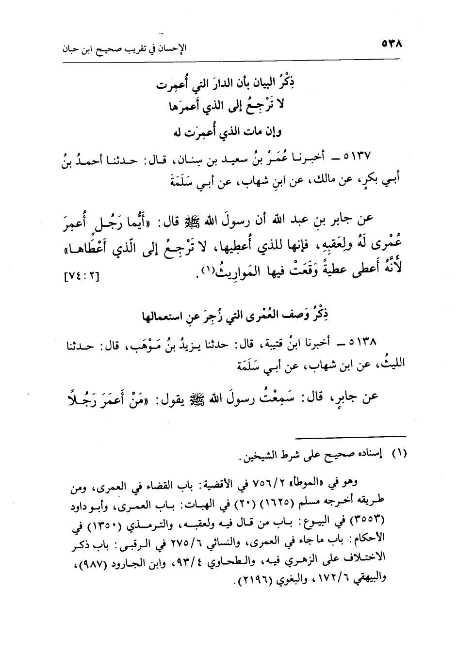 5137 - أَخْبَرَنَا عُمَرُ بْنُ سَعِيدِ بْنِ سِنَانٍ، قَالَ: حَدَّثَنَا أَحْمَدُ بْنُ أَبِي بَكْرٍ، عَنْ مَالِكٍ، عن بن شِهَابٍ، عَنْ أَبِي سَلَمَةَ عَنْ جَابِرِ بْنِ عَبْدِ اللَّهِ أَنَّ رَسُولَ اللَّهِ صَلَّى اللَّهُ عَلَيْهِ وَسَلَّمَ قَالَ: "أَيُّمَا رَجُلٍ أُعْمِرَ عُمْرَى لَهُ وَلِعَقِبِهِ، فَإِنَّهَا لِلَّذِي أُعْطِيَهَا، لَا تَرْجِعُ إِلَى الَّذِي أَعْطَاهَا" لِأَنَّهُ أَعْطَى عَطِيَّةً وَقَعَتْ فيها المواريث1. [2: 74]