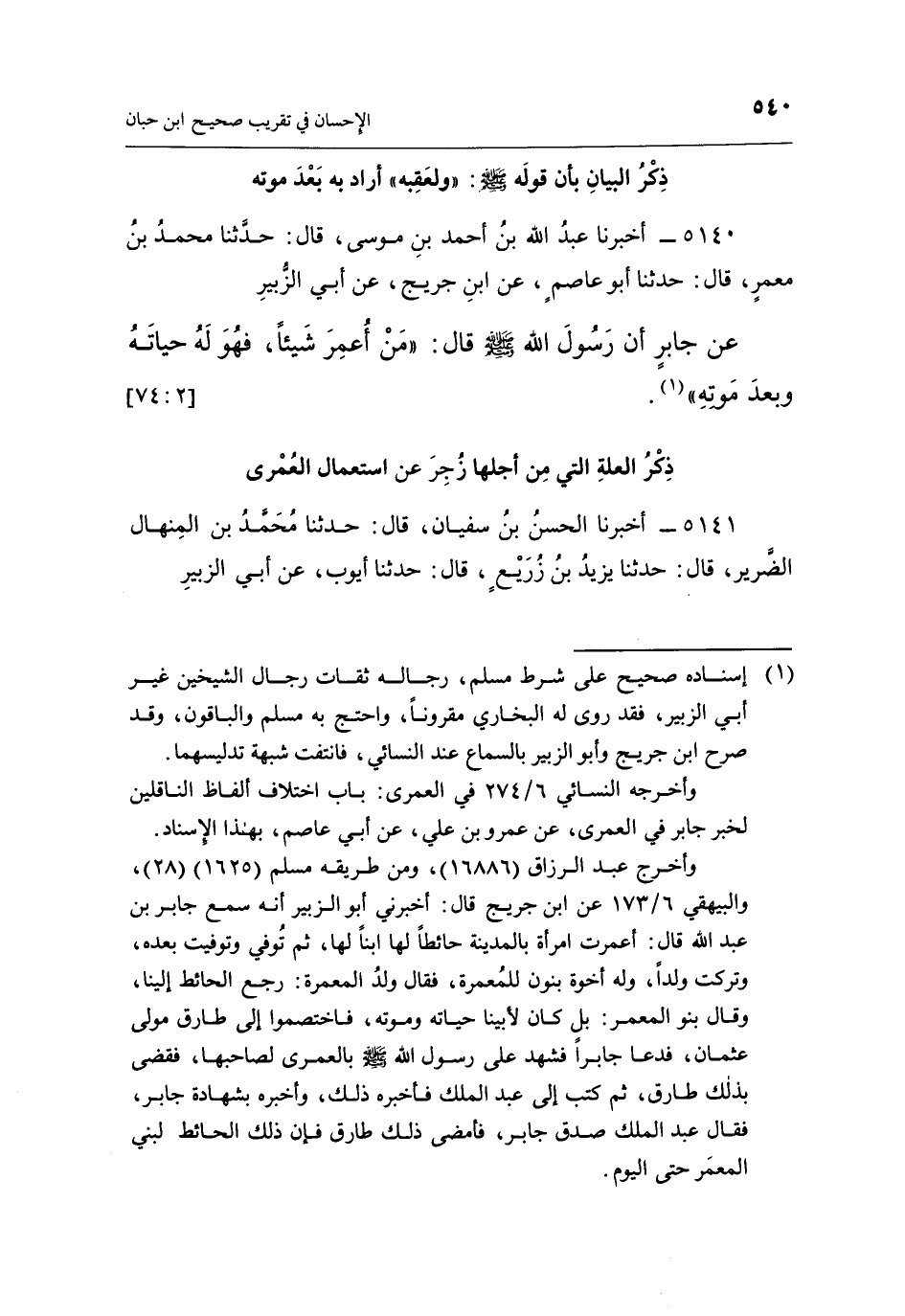 5140 - أَخْبَرَنَا عَبْدُ اللَّهِ بْنُ أَحْمَدَ بْنِ مُوسَى، قَالَ: حَدَّثَنَا مُحَمَّدُ بْنُ مَعْمَرٍ، قَالَ: حَدَّثَنَا أَبُو عاصم، عن بن جُرَيْجٍ، عَنْ أَبِي الزُّبَيْرِ عَنْ جَابِرٍ أَنَّ رَسُولَ اللَّهِ صَلَّى اللَّهُ عَلَيْهِ وَسَلَّمَ قَالَ: "مَنْ أُعْمِرَ شَيْئًا فَهُوَ لَهُ حَيَاتَهُ وَبَعْدَ موته"1. [2: 74]