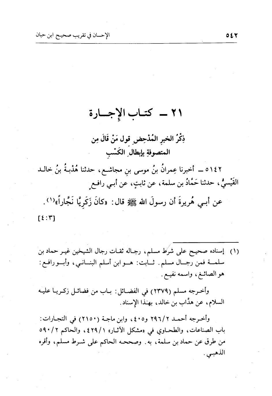 5142 - أَخْبَرَنَا عِمْرَانُ بْنُ مُوسَى بْنِ مُجَاشِعٍ، حَدَّثَنَا هُدْبَةُ بْنُ خَالِدٍ الْقَيْسِيُّ، حَدَّثَنَا حَمَّادُ بْنُ سَلَمَةَ، عَنْ ثَابِتٍ، عَنْ أَبِي رَافِعٍ، عَنْ أَبِي هُرَيْرَةَ، أَنَّ رَسُولَ اللَّهِ صَلَّى اللَّهُ عَلَيْهِ وَسَلَّمَ قَالَ: § «كَانَ زَكَرِيَّا نَجَّارًا»