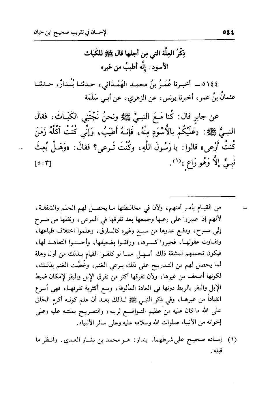 5144 - أَخْبَرَنَا عُمَرُ بْنُ مُحَمَّدٍ الْهَمْدَانِيُّ، حَدَّثَنَا بُنْدَارٌ، حَدَّثَنَا عُثْمَانُ بْنُ عُمَرَ، أَخْبَرَنَا يُونُسَ، عَنِ الزُّهْرِيِّ، عَنْ أَبِي سَلَمَةَ عَنْ جَابِرٍ قَالَ: كُنَّا مَعَ النَّبِيِّ صَلَّى اللَّهُ عَلَيْهِ وَسَلَّمَ وَنَحْنُ نَجْتَنِي الْكَبَاثَ، فَقَالَ النَّبِيُّ صَلَّى اللَّهُ عَلَيْهِ وَسَلَّمَ: "عَلَيْكُمْ بِالْأَسْوَدِ مِنْهُ، فَإِنَّهُ أَطْيَبُ، وَإِنِّي كُنْتُ آكُلُهُ زَمَنَ كُنْتُ أَرْعَى" قَالُوا: يَا رَسُولَ اللَّهِ، وَكُنْتَ تَرْعَى؟ فَقَالَ: "وَهَلْ بُعِثَ نَبِيٌّ إِلَّا وَهُوَ رَاعٍ"1. [3: 5]