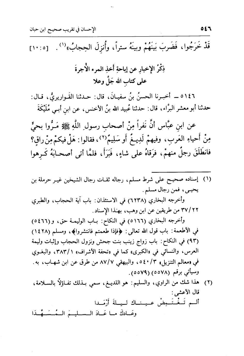 5146 - أَخْبَرَنَا الْحَسَنُ بْنُ سُفْيَانَ، قَالَ: حَدَّثَنَا الْقَوَارِيرِيُّ، قَالَ: حَدَّثَنَا أَبُو مَعْشَرٍ الْبَرَاءُ، قَالَ: حَدَّثَنَا عُبَيْدُ اللَّهِ بن الأخنس، عن بن أبي ملكيه عن بن عَبَّاسٍ أَنَّ نَفَرًا مِنْ أَصْحَابِ رَسُولِ اللَّهِ صَلَّى اللَّهُ عَلَيْهِ وَسَلَّمَ مَرُّوا بِحَيٍّ مِنْ أَحْيَاءِ الْعَرَبِ، وَفِيهِمْ لَدِيغٌ أَوْ سَلِيمٌ1، فَقَالُوا: هَلْ فِيكُمْ مِنْ رَاقٍ؟ فَانْطَلَقَ رَجُلٌ مِنْهُمْ، فَرَقَاهُ عَلَى شاءٍ، فَبَرَأَ، فَلَمَّا أَتَى أَصْحَابُهُ كرهوا