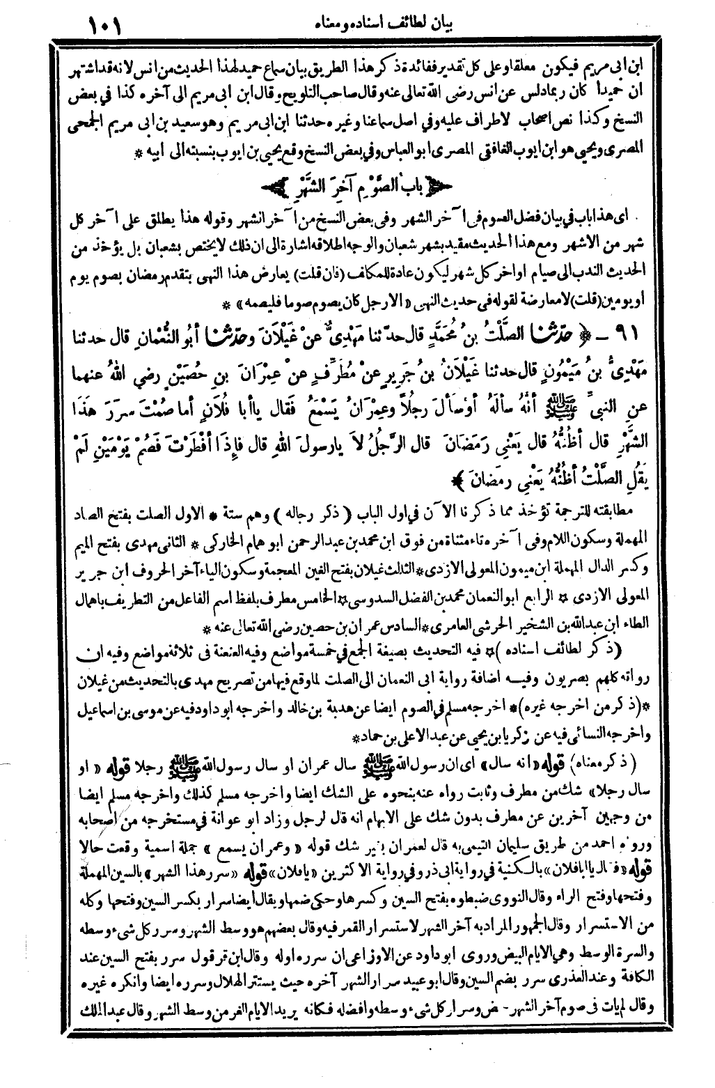 ذكر لطائف إِسْنَاده فِيهِ: التحديث بِصِيغَة الْجمع فِي خَمْسَة مَوَاضِع. وَفِيه: العنعنة فِي ثَلَاثَة مَوَاضِع. وَفِيه: أَن رُوَاته كلهم بصريون. وَفِيه: إِضَافَة رِوَايَة أبي النُّعْمَان إِلَى الصَّلْت لما وَقع فِيهَا من تَصْرِيح مهْدي بِالتَّحْدِيثِ من غيلَان.