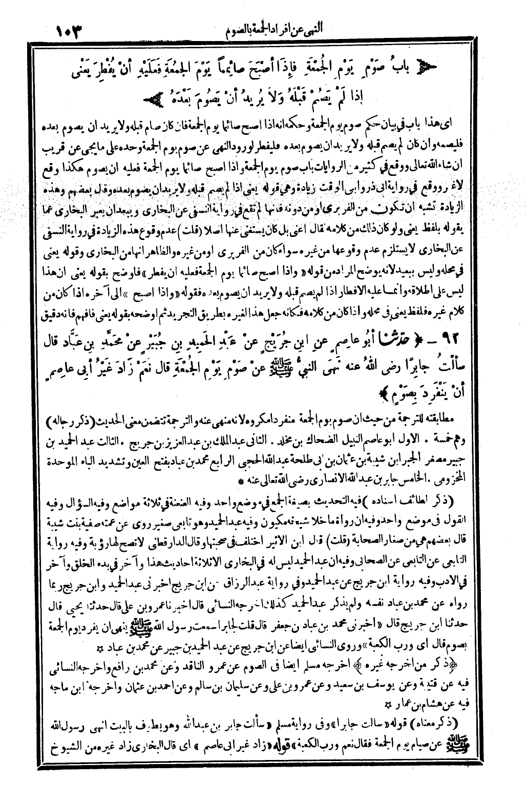 4891 - حدَّثنا أبُو عاصِمٍ عنِ ابنِ جُرَيْجٍ عنْ عَبْدِ الحَمِيدِ بنِ جُبَيْرٍ عنْ محَمَّدِ بنِ عَبَّادٍ قَالَ سألْتُ جابِرا رَضِي الله تَعَالَى عنهُ نَهَى النبيُّ صلى الله عَلَيْهِ وَسلم عنْ صَوْمِ يَوْمِ الجُمْعَةِ قَالَ نَعَمْ زَادَ غَيْرُ أبِي عاصِمٍ أنْ يَنْفَرِدَ بِصَوْمٍ.