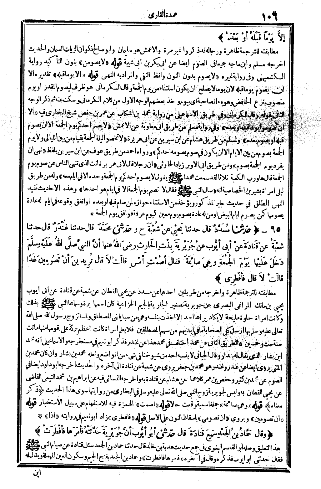 قَوْله: (لَا يصومنَّ) بنُون التَّأْكِيد رِوَايَة الْكشميهني، وَفِي رِوَايَة غَيره: (لَا يَصُوم) بِدُونِ النُّون، وَلَفظ النَّفْي، وَالْمرَاد بِهِ النَّهْي. قَوْله: (إلاَّ يَوْمًا قبله) ، تَقْدِيره: إلاَّ أَن يَصُوم يَوْمًا قبله، لِأَن يَوْمًا لَا يصلح أَن يكون اسْتثِْنَاء من يَوْم الْجُمُعَة. وَقَالَ الْكرْمَانِي: هُوَ ظرف ليصوم الْمُقدر، أَو يَوْم مَنْصُوب بِنَزْع الْخَافِض، وَهُوَ بَاء المصاحبة أَي: بِيَوْم، وَأخذ بَعضهم الْوَجْه الأول من كَلَام الْكرْمَانِي وَسكت عَنهُ، ثمَّ ذكر الْوَجْه الثَّانِي بقوله: وَقَالَ الْكرْمَانِي، وَفِي طَرِيق الْإِسْمَاعِيلِيّ من رِوَايَة مُحَمَّد بن أشكاب عَن عمر بن حَفْص، شيخ البُخَارِيّ، فِيهِ: (إِلَّا أَن تَصُومُوا يَوْمًا قبله أَو بعده) . وَفِي رِوَايَة مُسلم من طَرِيق أبي مُعَاوِيَة عَن الْأَعْمَش: لَا يصم أحدكُم يَوْم الْجُمُعَة إلاَّ أَن يَصُوم قبله أَو يَصُوم بعده) ، وَلمُسلم من طَرِيق هِشَام عَن ابْن سِيرِين عَن أبي هُرَيْرَة: (لَا تخصوا لَيْلَة الْجُمُعَة بِقِيَام من اللَّيَالِي، وَلَا يَوْم الْجُمُعَة بِصَوْم من بَين الْأَيَّام، إلاَّ أَن يكون فِي صَوْم يَصُومهُ أحدكُم) . وَرَوَاهُ أَحْمد من طَرِيق عَوْف عَن ابْن سِيرِين بِلَفْظ: (نهى أَن يفرد يَوْم الْجُمُعَة بِصَوْم) ، وَمن طَرِيق أبي الأوبر زِيَاد الْحَارِثِيّ: (أَن رجلا قَالَ لأبي هُرَيْرَة: أَنْت الَّذِي تنْهى النَّاس عَن صَوْم يَوْم الْجُمُعَة؟ قَالَ: هَا، وَرب الْكَعْبَة ثَلَاثًا لقد سَمِعت مُحَمَّدًا صلى الله عَلَيْهِ وَسلم يَقُول: لَا يَصُوم أحدكُم يَوْم الْجُمُعَة وَحده إلاَّ فِي أَيَّام مَعَه) . وَله من طَرِيق ليلى، امْرَأَة بشير بن الخصاصية، أَنه (سَأَلَ النَّبِي صلى الله عَلَيْهِ وَسلم فَقَالَ: لَا تصم يَوْم الْجُمُعَة إلاَّ فِي أَيَّام هُوَ أَحدهَا) . وَهَذِه الْأَحَادِيث تقيد النَّهْي الْمُطلق فِي حَدِيث جَابر الْمَذْكُور، وَيُؤْخَذ من الِاسْتِثْنَاء جَوَازه لمن صَامَ قبله أَو بعده، أَو اتّفق وُقُوعه فِي أَيَّام لَهُ عَادَة يصومها، كمن يَصُوم أَيَّام الْبيض أَو من لَهُ عَادَة بِصَوْم يَوْم معِين، كَيَوْم عَرَفَة فَوَافَقَ يَوْم الْجُمُعَة.