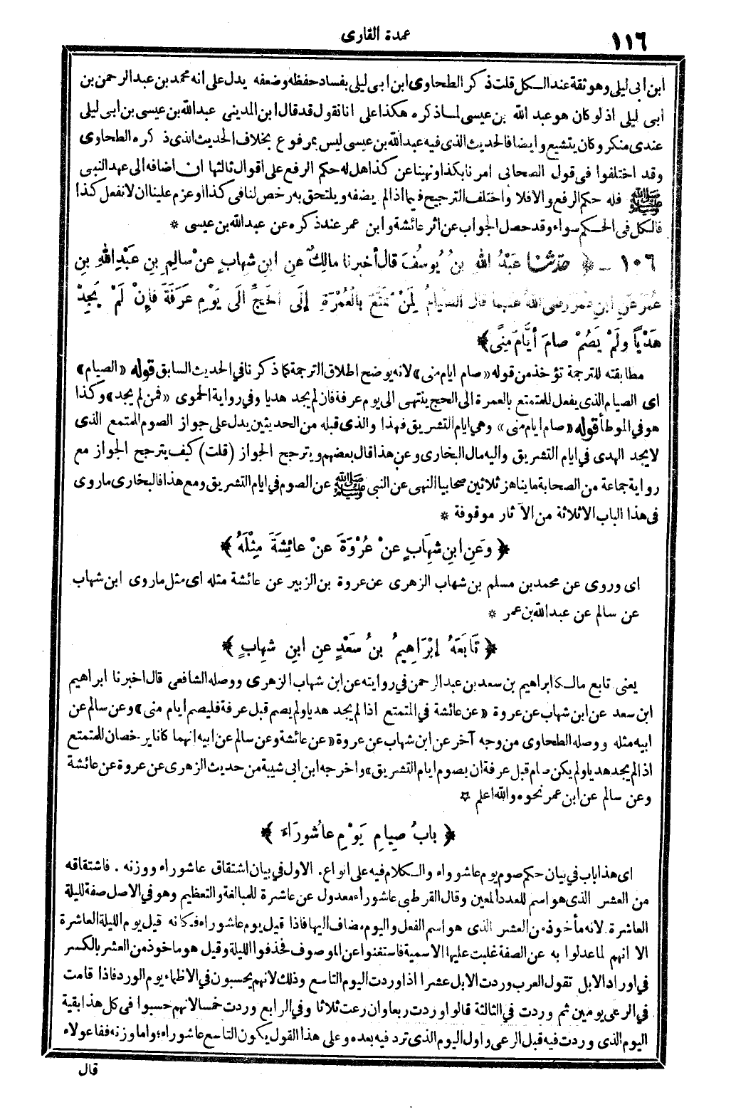 ابْن أبي ليلى، وَهُوَ ثِقَة عِنْد الْكل. قلت: ذكر الطَّحَاوِيّ ابْن أبي ليلى بِفساد حفظه وَضعه يدل على أَنه مُحَمَّد بن عبد الرَّحْمَن بن أبي ليلى، إِذْ لَو كَانَ هُوَ عبد الله بن عِيسَى لما ذكره هَكَذَا، على أَنا نقُول: قد قَالَ ابْن الْمَدِينِيّ: عبد الله بن عِيسَى بن أبي ليلى عِنْدِي مُنكر، وَكَانَ يتشيع، وَأَيْضًا فَالْحَدِيث الَّذِي فِيهِ عبد الله بن عِيسَى لَيْسَ بمرفوع، بِخِلَاف الحَدِيث الَّذِي ذكره الطَّحَاوِيّ وَقد اخْتلفُوا فِي قَول الصَّحَابِيّ: أمرنَا بِكَذَا ونهينا عَن كَذَا، هَل لَهُ حكم الرّفْع؟ على أَقْوَال: ثَالِثهَا إِن أَضَافَهُ إِلَى عهد النَّبِي صلى الله عَلَيْهِ وَسلم فَلهُ حكم الرّفْع، وإلاَّ فَلَا. وَاخْتلف التَّرْجِيح فِيمَا إِذا لم يضفه ويلتحق بِهِ، رخص لنا فِي كَذَا، أَو عزم علينا أَن لَا نَفْعل كَذَا. فَالْكل فِي الحكم سَوَاء، وَقد حصل الْجَواب عَن أثر عَائِشَة وَابْن عمر عِنْد ذكره عَن عبد الله بن عِيسَى.