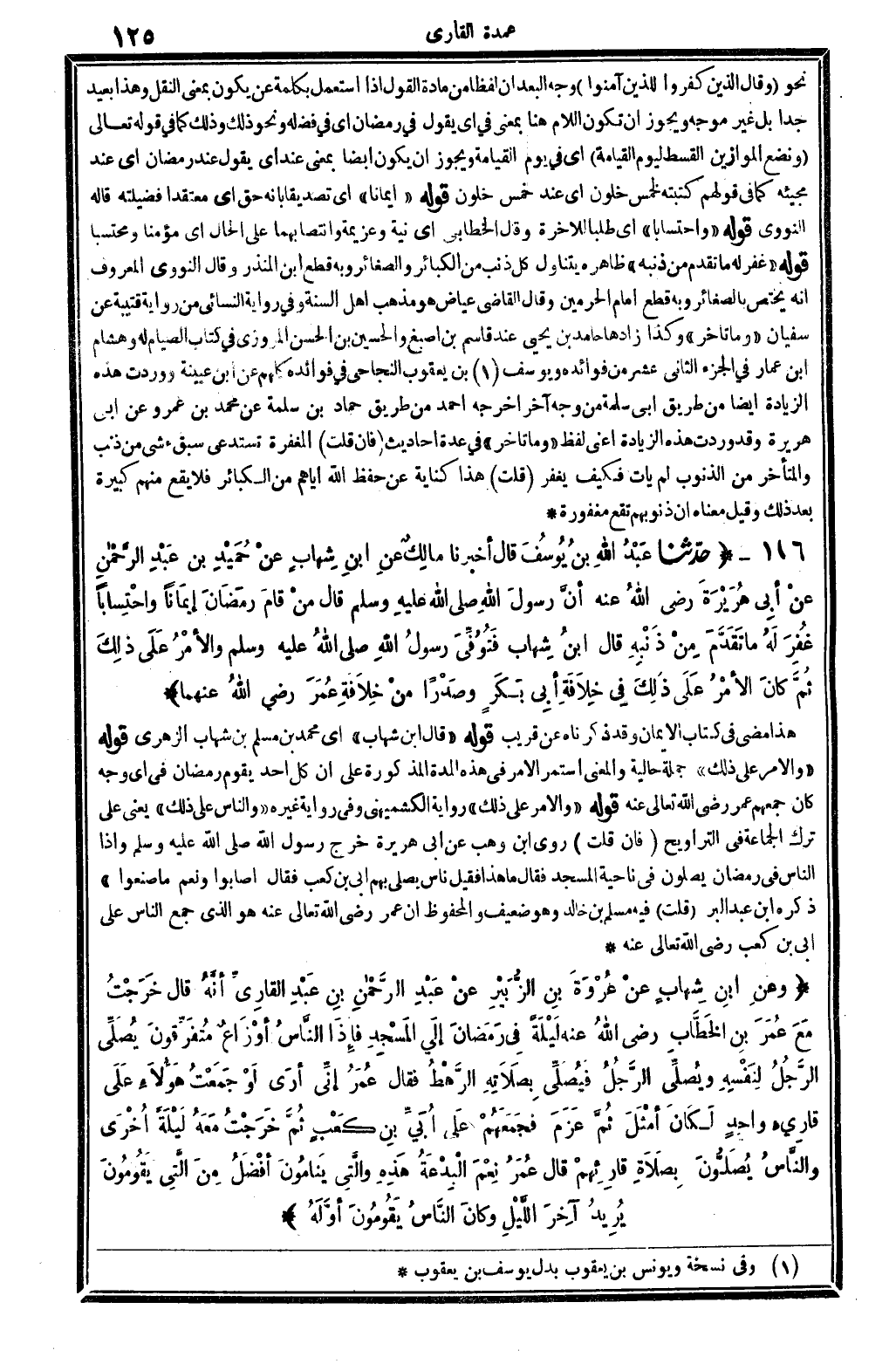 وعنِ ابنِ شِهَابٍ عنْ عُرْوَةَ بنِ الزُّبَيْرِ عنْ عَبْدِ الرَّحْمانِ بنِ عَبْدِ القَارِيِّ أنَّهُ قَالَ خَرَجْتُ مَعَ عُمَرَ بنِ الخَطَّابِ رَضِي الله تَعَالَى عنهُ لَيْلَةً فِي رمَضَانَ إلَى المَسْجِدِ فإذَا النَّاسُ أوْزَاعٌ مُتَفَرِّقُونَ يُصَلِّي الرَّجُلُ لِنَفْسِهِ ويُصَلِّي الرَّجُلُ فَيُصَلِّي بِصَلاتِهِ الرَّهْطُ فَقَالَ عُمَرُ إنِّي أرَى لَوْ جَمَعْتُ هؤلاَءِ عَلَى قاريءٍ واحِدٍ لكَانَ أمْثَلَ ثُمَّ عَزَمَ فَجَمَعَهُمْ عَلى أُبَيِّ بنِ كَعْبٍ ثُمَّ خَرَجْتُ مَعَهُ لَيْلَةً أُخْرَى والنَّاسُ يُصَلُّونَ بِصَلاةِ قَارِئِهِمْ قَالَ عُمَرُ نِعْمَ الْبِدْعَةُ هَذِهِ والَّتِي يَنامُونَ أفْضَلُ مِنَ الَّتِي يَقُومُونَ يُرِيدُ آخِرَ اللَّيْلِ وكانَ النَّاسُ يَقُومُونَ أوَّلَهُ.