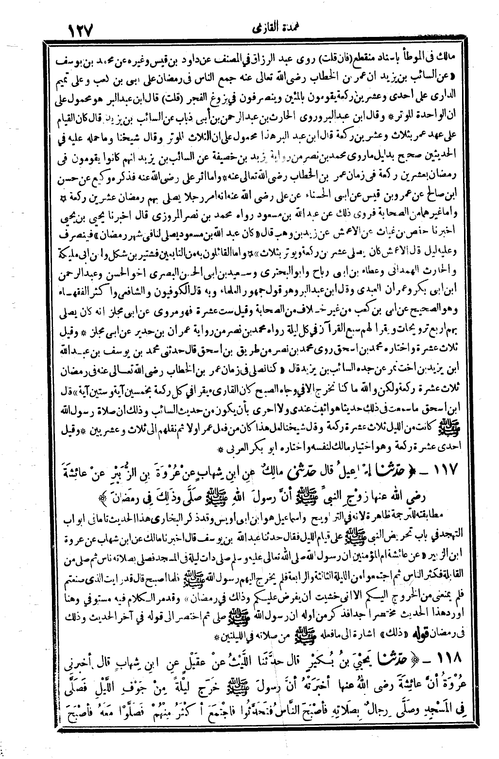مَالك فِي (الْمُوَطَّأ) بِإِسْنَاد مُنْقَطع فَإِن قلت: روى عبد الرَّزَّاق فِي (المُصَنّف) عَن دَاوُد بن قيس وَغَيره عَن مُحَمَّد بن يُوسُف (عَن السَّائِب بن يزِيد: أَن عمر بن الْخطاب، رَضِي الله تَعَالَى عَنهُ، جمع النَّاس فِي رَمَضَان على أبي بن كَعْب، وعَلى تَمِيم الدَّارِيّ على إِحْدَى وَعشْرين رَكْعَة يقومُونَ بالمئين وينصرفون فِي بزوغ الْفجْر، قلت: قَالَ ابْن عبد الْبر: هُوَ مَحْمُول على أَن الْوَاحِدَة للوتر. وَقَالَ ابْن عبد الْبر: وروى الْحَارِث بن عبد الرَّحْمَن بن أبي ذُبَاب عَن السَّائِب بن يزِيد، قَالَ: كَانَ الْقيام على عهد عمر بِثَلَاث وَعشْرين رَكْعَة. قَالَ ابْن عبد الْبر: هَذَا مَحْمُول على أَن الثَّلَاث للوتر. وَقَالَ شَيخنَا: وَمَا حمله عَلَيْهِ فِي الْحَدِيثين صَحِيح، بِدَلِيل مَا روى مُحَمَّد بن نصر من رِوَايَة يزِيد بن خصيفَة عَن السَّائِب بن يزِيد أَنهم كَانُوا يقومُونَ فِي رَمَضَان بِعشْرين رَكْعَة فِي زمَان عمر بن الْخطاب، رَضِي الله تَعَالَى عَنهُ.