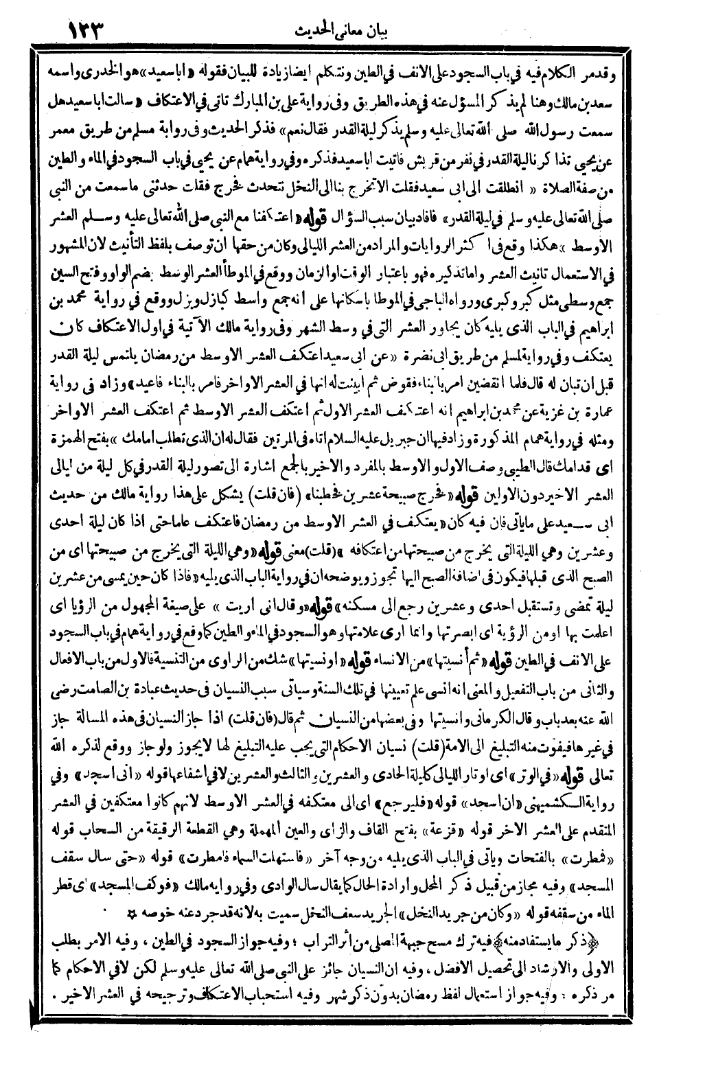 وَقد مر الْكَلَام فِيهِ فِي بَاب السُّجُود على الْأنف فِي الطين ونتكلم أَيْضا زِيَادَة للْبَيَان فَقَوله " أَبَا سعيد " هُوَ الْخُدْرِيّ واسْمه سعد بن مَالك وَهنا لم يذكر المسؤل عَنهُ فِي هَذِه الطَّرِيق وَفِي رِوَايَة عَليّ بن الْمُبَارك تَأتي فِي الِاعْتِكَاف " سَأَلت أَبَا سعيد هَل سَمِعت رَسُول الله - صَلَّى اللَّهُ عَلَيْهِ وَسَلَّم َ - يذكر لَيْلَة الْقدر فَقَالَ نعم " فَذكر الحَدِيث وَفِي رِوَايَة مُسلم من طَرِيق معمر عَن يحيى تَذَاكرنَا لَيْلَة الْقدر فِي نفر من قُرَيْش فَأتيت أَبَا سعيد فَذكره وَفِي رِوَايَة همام عَن يحيى فِي بَاب السُّجُود فِي المَاء والطين من صفة الصَّلَاة " انْطَلَقت إِلَى أبي سعيد فَقلت أَلا تخرج بِنَا إِلَى النّخل نتحدث فَخرج فَقلت حَدثنِي مَا سَمِعت من النَّبِي - صَلَّى اللَّهُ عَلَيْهِ وَسَلَّم َ - فِي لَيْلَة الْقدر " فَأفَاد بَيَان سَبَب السُّؤَال قَوْله " اعتكفنا مَعَ النَّبِي - صَلَّى اللَّهُ عَلَيْهِ وَسَلَّم َ - الْعشْر الْأَوْسَط " هَكَذَا وَقع فِي أَكثر الرِّوَايَات وَالْمرَاد من الْعشْر اللَّيَالِي وَكَانَ من حَقّهَا أَن تُوصَف بِلَفْظ التَّأْنِيث لِأَن الْمَشْهُور فِي الِاسْتِعْمَال تَأْنِيث الْعشْر وَأما تذكيره فَهُوَ بِاعْتِبَار الْوَقْت أَو الزَّمَان وَوَقع فِي الْمُوَطَّأ الْعشْر الْوسط بِضَم الْوَاو وَفتح السِّين جمع وسطى مثل كبر وكبرى وَرَوَاهُ الْبَاجِيّ فِي الْمُوَطَّأ بإسكانها على أَنه جمع وَاسِط كبازل وبزل وَوَقع فِي رِوَايَة مُحَمَّد بن إِبْرَاهِيم فِي الْبَاب الَّذِي يَلِيهِ كَانَ يُجَاوز الْعشْر الَّتِي فِي وسط الشَّهْر وَفِي رِوَايَة مَالك الْآتِيَة فِي أول الِاعْتِكَاف كَانَ يعْتَكف وَفِي رِوَايَة لمُسلم من طَرِيق أبي نَضرة " عَن أبي سعيد اعْتكف الْعشْر الْأَوْسَط من رَمَضَان يلْتَمس لَيْلَة الْقدر قبل أَن تبان لَهُ قَالَ فَلَمَّا انقضين أَمر بِالْبِنَاءِ فقوض ثمَّ أبينت لَهُ أَنَّهَا فِي الْعشْر الْأَوَاخِر فَأمر بِالْبِنَاءِ فأعيد " وَزَاد فِي رِوَايَة عمَارَة بن غزيَّة عَن مُحَمَّد بن إِبْرَاهِيم أَنه اعْتكف الْعشْر الأول ثمَّ اعْتكف الْعشْر الْأَوْسَط ثمَّ اعْتكف الْعشْر الْأَوَاخِر وَمثله فِي رِوَايَة همام الْمَذْكُورَة وَزَاد فِيهَا أَن جِبْرِيل عَلَيْهِ السَّلَام أَتَاهُ فِي الْمَرَّتَيْنِ فَقَالَ لَهُ إِن الَّذِي تطلب أمامك " بِفَتْح الْهمزَة أَي قدامك قَالَ الطَّيِّبِيّ وصف الأول والأوسط بالمفرد والأخير بِالْجمعِ إِشَارَة إِلَى تصور لَيْلَة الْقدر فِي كل لَيْلَة من ليَالِي الْعشْر الْأَخير دون الْأَوَّلين قَوْله " فَخرج صَبِيحَة عشْرين فَخَطَبنَا " (فَإِن قلت) يشكل على هَذَا رِوَايَة مَالك من حَدِيث أبي سعيد على مَا يَأْتِي فَإِن فِيهِ كَانَ " يعْتَكف فِي الْعشْر الْأَوْسَط من رَمَضَان فاعتكف عَاما حَتَّى إِذا كَانَ لَيْلَة إِحْدَى وَعشْرين وَهِي اللَّيْلَة الَّتِي يخرج من صبيحتها من اعْتِكَافه " (قلت) معنى قَوْله " وَهِي اللَّيْلَة الَّتِي يخرج من صبيحتها أَي من الصُّبْح الَّذِي قبلهَا فَيكون فِي إِضَافَة الصُّبْح إِلَيْهَا تجوز ويوضحه أَن فِي رِوَايَة الْبَاب الَّذِي يَلِيهِ " فَإِذا كَانَ حِين يُمْسِي من عشْرين لَيْلَة تمْضِي وتستقبل إِحْدَى وَعشْرين رَجَعَ إِلَى مَسْكَنه " قَوْله " وَقَالَ إِنِّي أريت " على صِيغَة الْمَجْهُول من الرُّؤْيَا أَي أعلمت بهَا أَو من الرُّؤْيَة أَي أبصرتها وَإِنَّمَا أرى علامتها وَهُوَ السُّجُود فِي المَاء والطين كَمَا وَقع فِي رِوَايَة همام فِي بَاب السُّجُود على الْأنف فِي الطين قَوْله " ثمَّ أنسيتها " من الإنساء قَوْله " أَو نسيتهَا " شكّ من الرَّاوِي من التنسية فَالْأول من بَاب الْأَفْعَال وَالثَّانِي من بَاب التفعيل وَالْمعْنَى أَنه أنسى علم تَعْيِينهَا فِي تِلْكَ السّنة وَسَيَأْتِي سَبَب النسْيَان فِي حَدِي