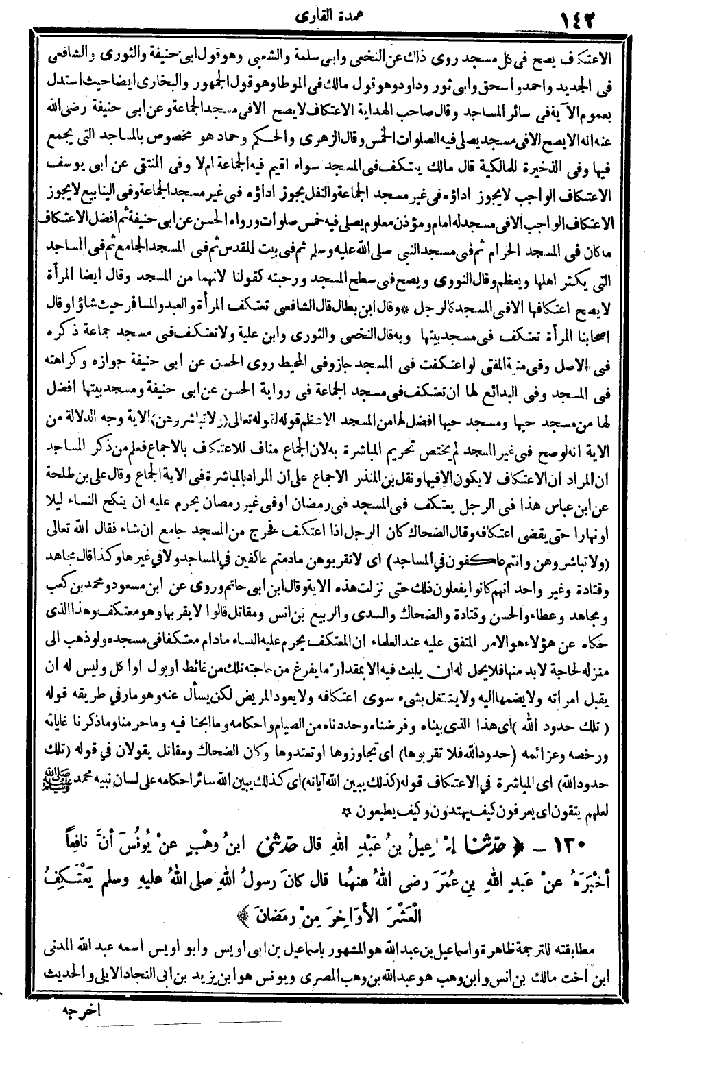 وَقَالَ أَيْضا: الْمَرْأَة لَا يَصح اعتكافها إلاَّ فِي الْمَسْجِد كَالرّجلِ. وَقَالَ ابْن بطال: قَالَ الشَّافِعِي: تعتكف الْمَرْأَة وَالْعَبْد وَالْمُسَافر حَيْثُ شاؤوا، وَقَالَ أَصْحَابنَا: الْمَرْأَة تعتكف فِي مَسْجِد بَيتهَا، وَبِه قَالَ النَّخعِيّ وَالثَّوْري وَابْن علية. وَلَا تعتكف فِي مَسْجِد جمَاعَة، ذكره فِي الأَصْل. وَفِي (منية الْمُفْتِي) : لَو اعتكفت فِي الْمَسْجِد جَازَ، وَفِي (الْمُحِيط) : روى الْحسن عَن أبي حنيفَة جَوَازه وكراهته فِي الْمَسْجِد. وَفِي (الْبَدَائِع) : لَهَا أَن تعتكف فِي مَسْجِد الْجَمَاعَة. فِي رِوَايَة الْحسن عَن أبي حنيفَة، وَمَسْجِد بَيتهَا أفضل لَهَا من مَسْجِد حيها، وَمَسْجِد حيها أفضل لَهَا من الْمَسْجِد الْأَعْظَم. قَوْله: لقَوْله تَعَالَى: {وَلَا تباشروهن} (الْبَقَرَة: 781) . الْآيَة وَجه الدّلَالَة من الْآيَة أَنه: لَو صَحَّ فِي غير الْمَسْجِد لم يخْتَص تَحْرِيم الْمُبَاشرَة بِهِ، لِأَن الْجِمَاع منافٍ للاعتكاف بِالْإِجْمَاع، فَعلم من ذكر الْمَسَاجِد أَن المُرَاد بِالْمُبَاشرَةِ أَن الإعتكاف لايكون أَلا فِيهَا وَنقل ابْن الْمُنْذر الاجماع على أَن المُرَاد فِي الْآيَة الْجِمَاع. وَقَالَ عَليّ بن طَلْحَة عَن ابْن عَبَّاس، هَذَا فِي الرجل يعْتَكف فِي الْمَسْجِد فِي رَمَضَان أَو فِي غير رَمَضَان: يحرم عَلَيْهِ أَن ينْكح النِّسَاء لَيْلًا أَو نَهَارا حَتَّى يقْضِي اعْتِكَافه، وَقَالَ الضَّحَّاك: كَانَ الرجل إِذا اعْتكف فَخرج من الْمَسْجِد جَامع إِن شَاءَ، فَقَالَ الله تَعَالَى: {وَلَا تباشروهن وَأَنْتُم عاكفون فِي الْمَسَاجِد} (الْبَقَرَة: 781) . أَي: لَا تقربوهن مَا دمتم عاكفين فِي الْمَسَاجِد، وَلَا فِي غَيرهَا، وَكَذَا قَالَ مُجَاهِد وَقَتَادَة وَغير وَاحِد: إِنَّهُم كَانُوا يَفْعَلُونَ ذَلِك حَتَّى نزلت هَذِه الْآيَة، وَقَالَ ابْن أبي حَاتِم: وَرُوِيَ عَن ابْن مَسْعُود وَمُحَمّد بن كَعْب وَمُجاهد وَعَطَاء وَالْحسن وَقَتَادَة وَالضَّحَّاك وَالسُّديّ وَالربيع بن أنس وَمُقَاتِل، قَالُوا: لَا يقربهَا وَهُوَ معتكف، وَهَذَا الَّذِي حَكَاهُ عَن هَؤُلَاءِ هُوَ الْأَمر الْمُتَّفق عَلَيْهِ عِنْد الْعلمَاء: أَن الْمُعْتَكف يحرم عَلَيْهِ النِّسَاء مَا دَامَ معتكفا فِي مَسْجده، وَلَو ذهب إِلَى منزله لحَاجَة لَا بُد مِنْهَا فَلَا يحل لَهُ أَن يلبث فِيهِ إلاَّ بِمِقْدَار مَا يفرغ من حَاجته تِلْكَ، من: غَائِط أَو بَوْل أَو أكل، وَلَيْسَ لَهُ أَن يقبل امْرَأَته وَلَا يضمها إِلَيْهِ، وَلَا يشْتَغل بِشَيْء سوى اعْتِكَافه، وَلَا يعود الْمَرِيض، لَكِن يسْأَل عَنهُ، وَهُوَ مار فِي طَرِيقه. قَوْله: {تِلْكَ حُدُود الله} (الْبَقَرَة: 781) . أَي هَذَا الَّذِي بَيناهُ وفرضناه وحددناه من الصّيام وَأَحْكَامه، وَمَا أبحنا فِيهِ وَمَا حرمنا، وَمَا ذكرنَا غاياته ورخصه وعزائمه: {حُدُود الله فَلَا تقربوها} (الْبَقَرَة: 781) . أَي: تجاوزوها أَو تعتدوها، وَكَانَ الضَّحَّاك وَمُقَاتِل يَقُولَانِ فِي قَوْله: {تِلْكَ حُدُود الله} (الْبَقَرَة: 781) . أَي: الْمُبَاشرَة فِي الِاعْتِكَاف. قَوْله: {كَذَلِك يبين الله آيَاته} (الْبَقَرَة: 781) . أَي: كَذَلِك يبين الله سَائِر أَحْكَامه على لِسَان نبيه مُحَمَّد صلى الله عَلَيْهِ وَسلم لَعَلَّهُم يَتَّقُونَ، أَي: يعْرفُونَ كَيفَ يَهْتَدُونَ وَكَيف يطيعون.