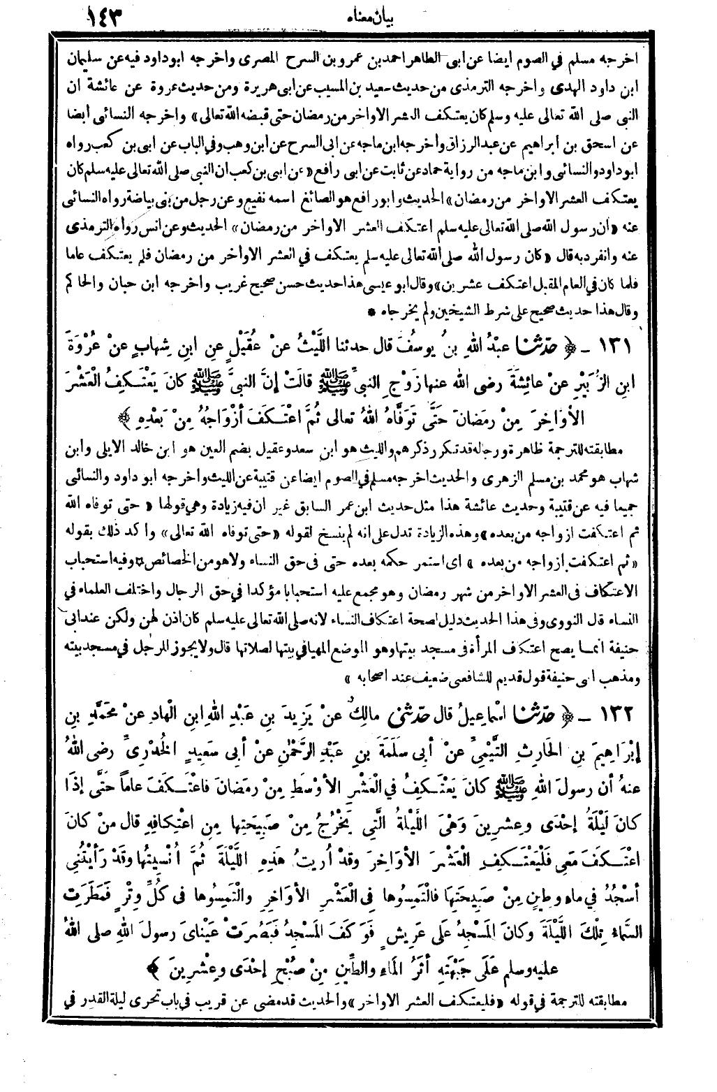 7202 - حدَّثنا إسماعيلُ قَالَ حدَّثني مالِكٌ عنْ يَزِيدَ بنِ عَبْدِ الله ابنِ الْهادِ عنْ محَمَّدِ بنِ إبْرَاهِيمَ بنِ الحَارِثِ التَّيْمِيِّ عنْ أبِي سلَمَةَ بنِ عَبْدِ الرَّحْمانِ عنْ أبِي سَعِيدٍ الخُدْرِيِّ رَضِي الله تَعَالَى عنهُ أنَّ رسولَ الله صلى الله عَلَيْهِ وَسلم كانَ يَعْتَكِفُ فِي العَشْرِ الأوْسَطِ مِنْ رَمَضانَ فاعْتَكَفَ عَاما حَتَّى إذَا كانَ لَيْلَةُ إحْدَى وعِشْرِينَ وَهْيَ اللَّيْلَةُ الَّتِي يَخْرُجُ مِنْ صَبِيحَتِهَا مِنْ اعْتِكافِهِ قَالَ منْ كانَ اعْتَكَفَ مَعِي فَلْيَعْتَكِفِ الْعَشْرَ الأَوَاخِرَ وقدْ أُريتُ هَذِهِ اللَّيْلَةَ ثُمَّ أُنْسِيتُهَا وقَدْ رأيْتُنِي أسْجُدُ فِي ماءٍ وطِينٍ مِنْ صَبِيحَتِهَا فالْتَمِسُوهَا فِي العَشْرِ الأوَاخِرِ والْتَمِسُوهَا فِي كُلِّ وِتْرٍ فَمَطَرَتِ السَّمَاءُ تِلْكَ اللَّيْلَةَ وكانَ المَسْجِدُ عَلى عَرِيشٍ فوَكَفَ الْمَسْجِدُ فَبَصُرَتْ عَينَايَ رسولَ الله صلى الله عَلَيْهِ وَسلم عَلَى جَبْهَتِهِ أثَرُ المَاءِ والطِّينِ مِنْ صْبْحِ إحْدَى وعِشْرِينَ. .