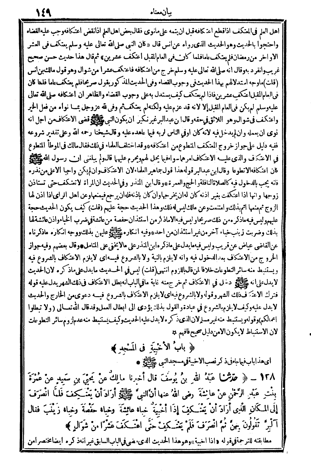 4302 - حدَّثنا عَبْدُ الله بنُ يُوسُفَ قَالَ أخبرنَا مالِكٌ عنْ يَحْيَى بنِ سَعِيدٍ عنْ عُمْرَةَ بِنْتِ عَبْدِ الرَّحْمانِ عنْ عائِشَةَ رَضِي الله تَعَالَى عَنْهَا أنَّ النبيَّ صلى الله عَلَيْهِ وَسلم أرَادَ أنْ يَعْتَكِفَ فَلَمَّا انْصَرَفَ إلَى المَكانِ الَّذِي أرَادَ أنْ يَعْتَكِفِ إذَا أخْبِيَةٌ خباءُ عائِشَةَ وخِباءُ حَفْصَةَ وخِبَاءُ زَيْنَبَ فَقَالَ آلْبِرَّ تَقُولُونَ بِهنَّ ثُمَّ انْصَرَفَ فلَمْ يَعْتَكِفْ حَتَّى اعْتَكَفَ عَشْرا منْ شَوَّالٍ. .