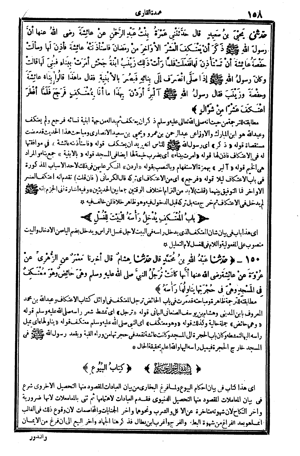 حدَّثني يَحْيَى بنُ سَعِيدٍ قَالَ حدَّثَتْنِي عَمْرَةُ بِنْتُ عَبْدِ الرَّحْمانِ عنْ عائِشَةَ رَضِي الله تَعَالَى عَنْهَا أنَّ رسولَ الله صلى الله عَلَيْهِ وَسلم ذَكَرَ أنْ يَعْتَكِفَ الْعَشْرَ الأوَاخِرَ منْ رَمَضَانَ فاسْتَأذَنَتْهُ عائِشَة فأذِنَ لَها وسألَتْ حَفْصَةُ عائِشَةَ أنْ تَسْتَأذِنَ لَها فَفَعَلَتْ فلمَّا رَأتْ ذَلِكَ زَيْنَبُ ابنَةُ جَحْشٍ أمَرَتْ بِبِناءٍ فبُنِيَ لَهَا قالَتْ وكانَ رسولُ الله صلى الله عَلَيْهِ وَسلم إذَا صَلَّى انْصَرَفَ إلَى بِنَائِهِ فبَصُرَ بالأبْنِيَةِ فَقَالَ مَا هَذَا قالُوا بِناءُ عائِشَةَ وحفْصَةَ وزَيْنَبَ فَقَالَ رسولُ الله صلى الله عَلَيْهِ وَسلم آلْبِرَّ أرَدْنَ بِهَذَا مَا أنَا بِمُعْتَكِفٍ فرَجَعَ فلَمَّا أفْطَرَ اعْتَكَفَ عَشْرا مِنْ شَوَّالٍ. .